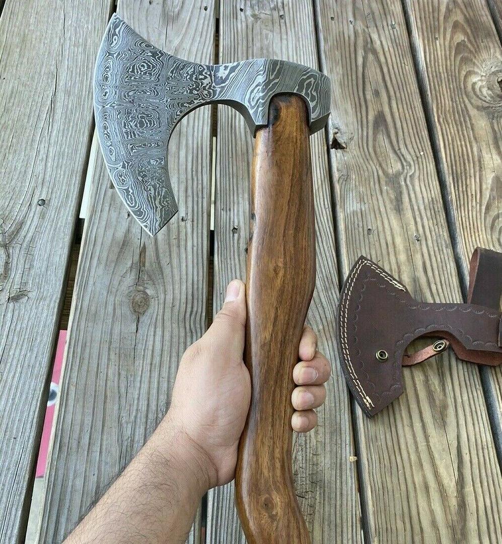 Hand Forged Damascus Steel Rosewood Handle Tomahawk Hatchet Axe with Leather Sheath