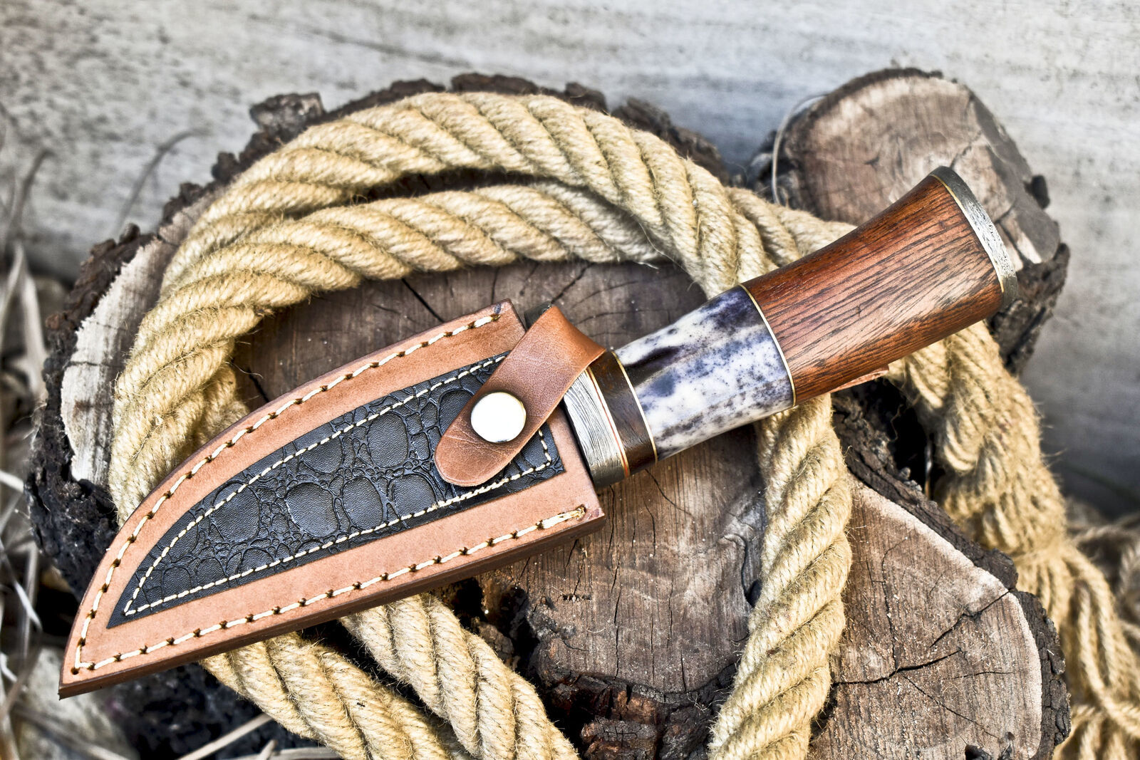 Discover the exceptional quality of this hand forged Damascus steel skinner knife, designed specifically for hunters and outdoor enthusiasts. The blade is expertly crafted from a blend of 1095 and 15N20 steel, layered repeatedly and acid-etched to reveal a stunning pattern that enhances both beauty and durability. This skinner knife features a wide, short blade that is rigid and oil tempered to 58-60 HRC, providing a sharp, resilient edge ideal for skinning tasks. The handle is made from durable hard wood, offering a comfortable grip, while the elegant Damascus guard adds extra protection and style. Each knife is handmade without CNC machining or precut blanks, ensuring that every piece is unique with subtle handcrafted characteristics. The knife comes with a thick, hand-tooled leather sheath designed for long-lasting use in rugged outdoor conditions. This Damascus skinner hunting knife is a perfect blend of traditional craftsmanship and modern performance, making it a reliable tool for hunting, skinning, and fieldwork.