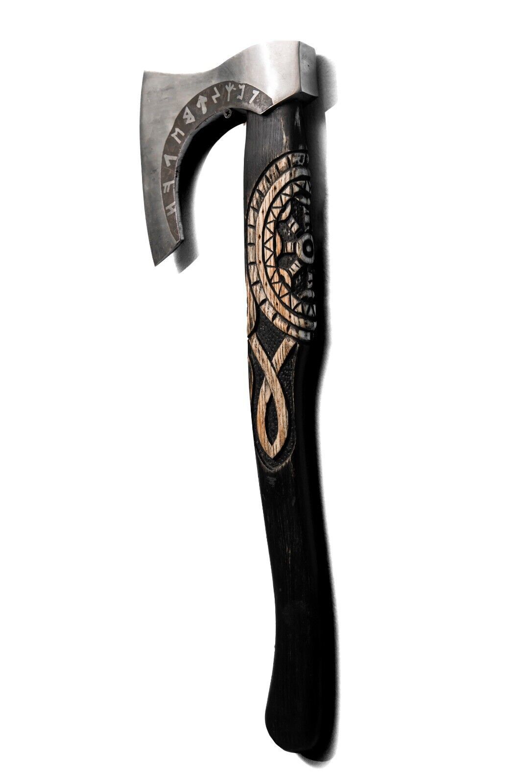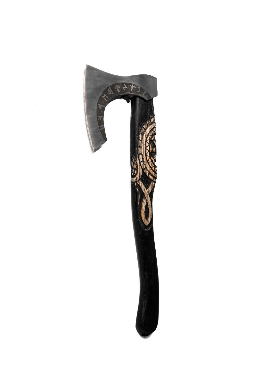 The blade features an etched Viking-inspired design, a striking tribute to traditional artistry, while still delivering powerful cutting performance. Its black ashwood handle, wrapped in leather, offers both strength and style. The leather wrapping enhances grip and control, making the axe comfortable to use while adding a rugged, authentic look.