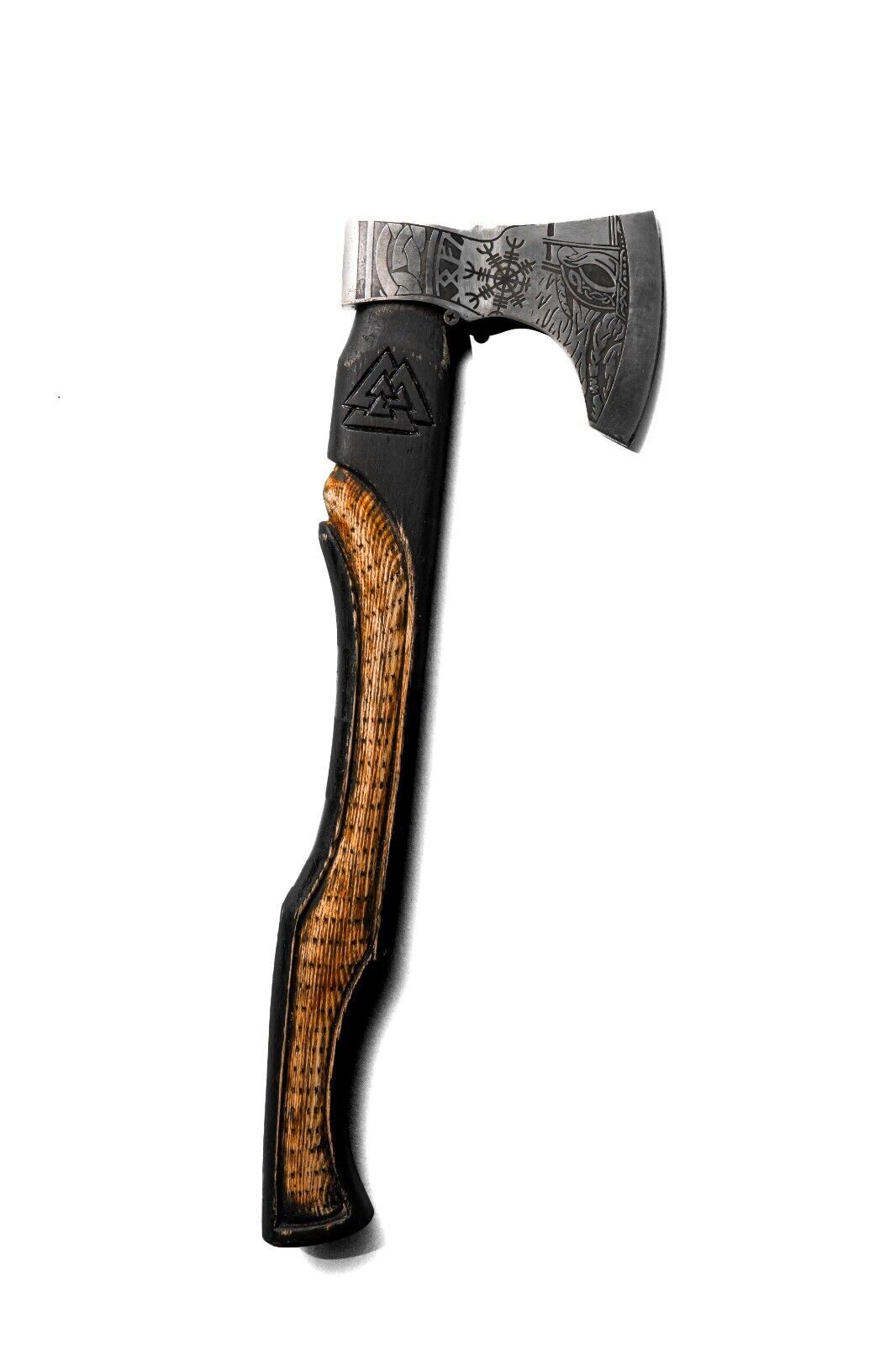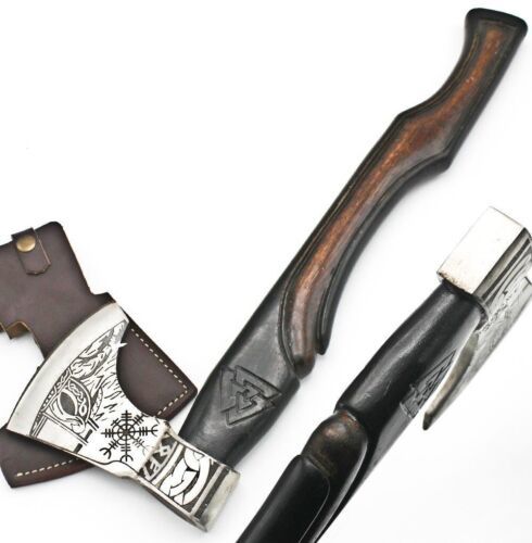 Experience the strength and artistry of ancient Viking craftsmanship with this hand forged tribal axe. Crafted from high carbon steel, the 19-inch axe with a 6.5-inch razor-sharp edge delivers outstanding cutting power, durability, and long-lasting performance. Its etched blade showcases a unique tribal Viking design, paying homage to traditional Nordic weapons while standing out as a functional work of art.