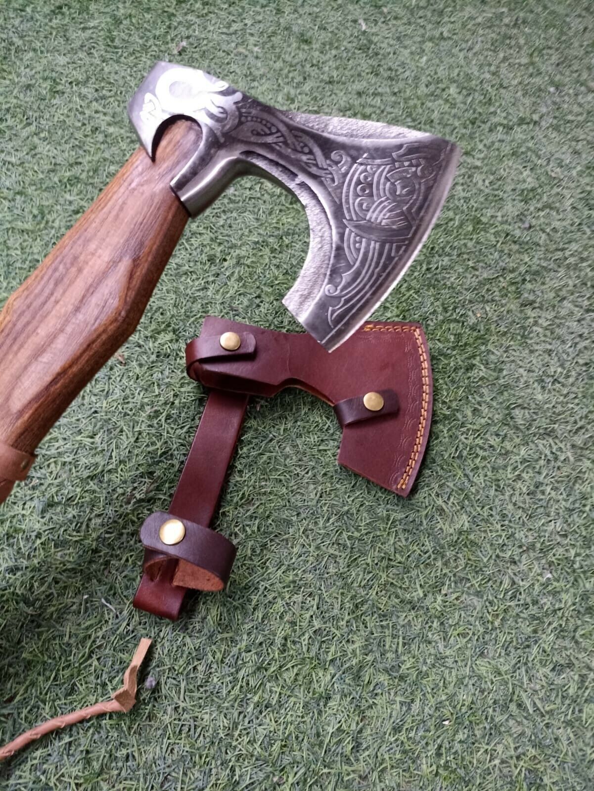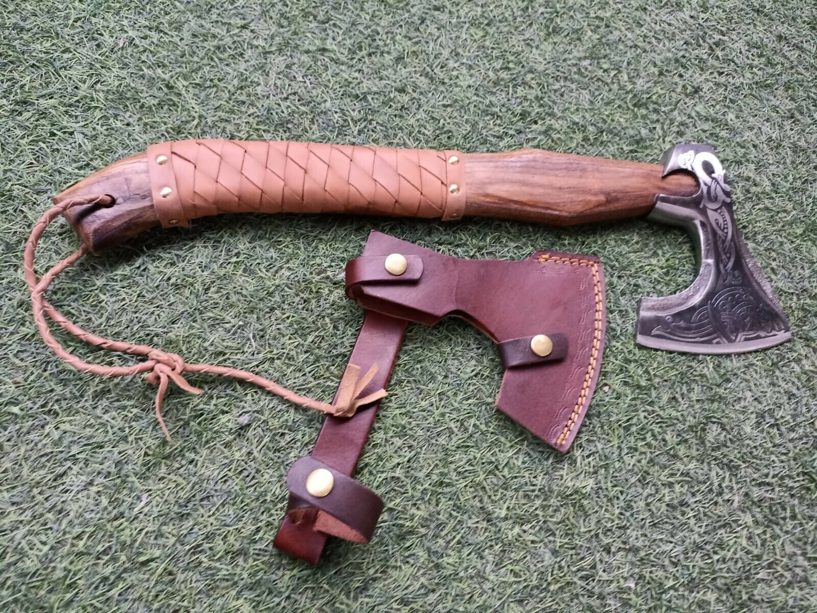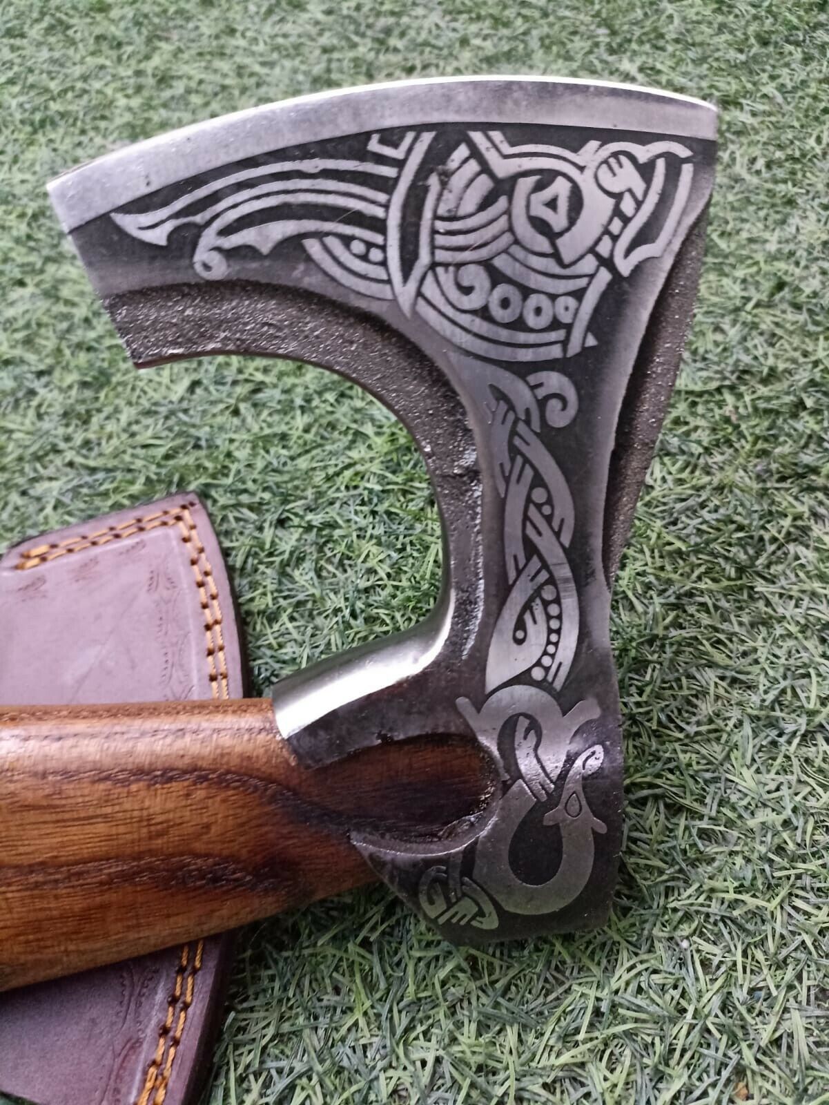 Bring the power and craftsmanship of the Vikings to your collection with this Hand Forged High Carbon Steel Viking Battle Axe. Measuring 18.5 inches overall, the axe features a 6.5-inch blade and a 5-inch wide cutting edge, expertly crafted from durable 1095 high-carbon steel. Each blade undergoes precise heat treatment to achieve a sharp, long-lasting edge ideal for outdoor use, chopping, or display. The handle combines ash wood and a leather wrap, providing a comfortable, secure grip while enhancing its classic Norse design. Every axe is handmade, ensuring unique characteristics and exceptional quality. This battle axe comes with a premium leather sheath to protect the blade during storage or transport. Whether as a gift, a collectible, or a functional tool, this Viking axe embodies history, strength, and artistry. Caution is advised as the blade is razor-sharp. Each axe is carefully packaged to ensure it arrives in perfect condition, and combined shipping discounts are available for multiple purchases.
