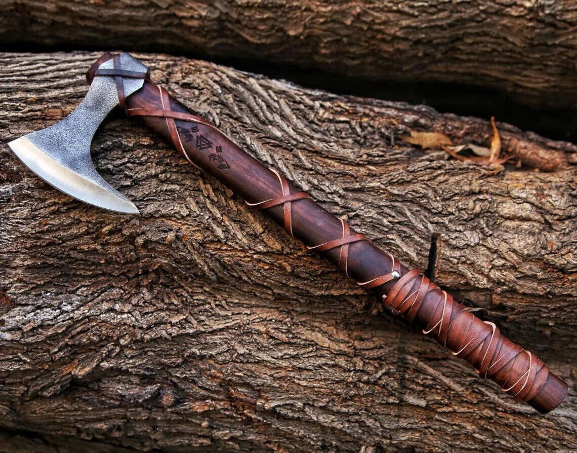 This hand forged Viking tomahawk is crafted from high carbon steel, designed for strength, sharpness, and long-lasting performance. The axe head is hand-hammered with a sharpened cutting edge, making it a powerful and reliable tool for chopping, splitting, and outdoor use. Built with traditional forging techniques, this tomahawk combines durability with authentic Viking-inspired craftsmanship.The axe measures 22 inches overall, with a 6.2-inch blade and a 5.5-inch cutting edge, offering excellent balance and cutting power. The handle is made from carefully selected hardwood, chosen for its natural strength, flexibility, and unique grain, ensuring a secure grip and resilience for heavy-duty tasks.For safe storage and convenient carry, this tomahawk comes with a premium hand-tooled leather sheath. The sheath is made from extra-thick leather with strong stitching, designed to last through years of rugged use. It can be worn on a belt and provides complete protection for the cutting edge when not in use.