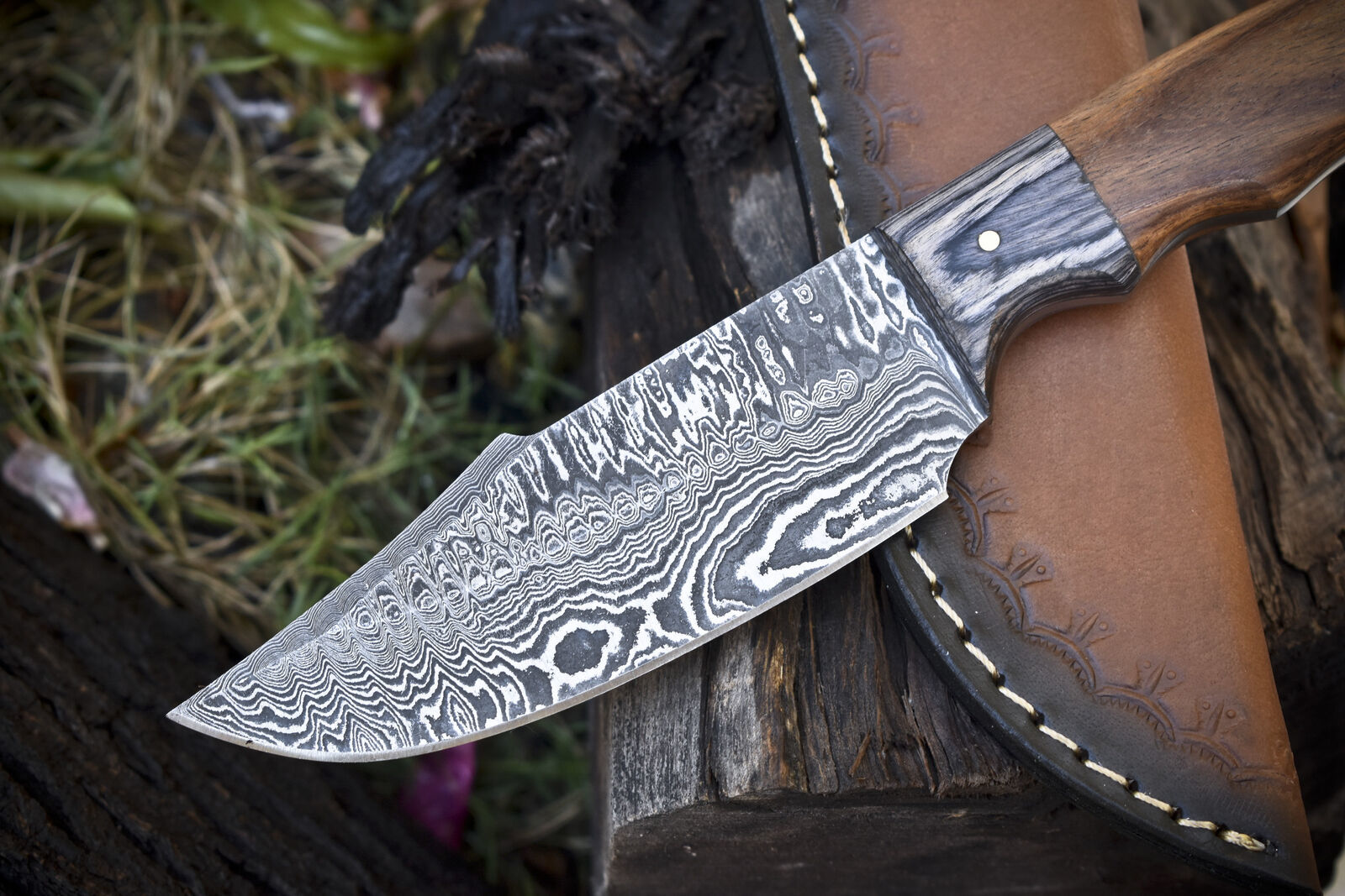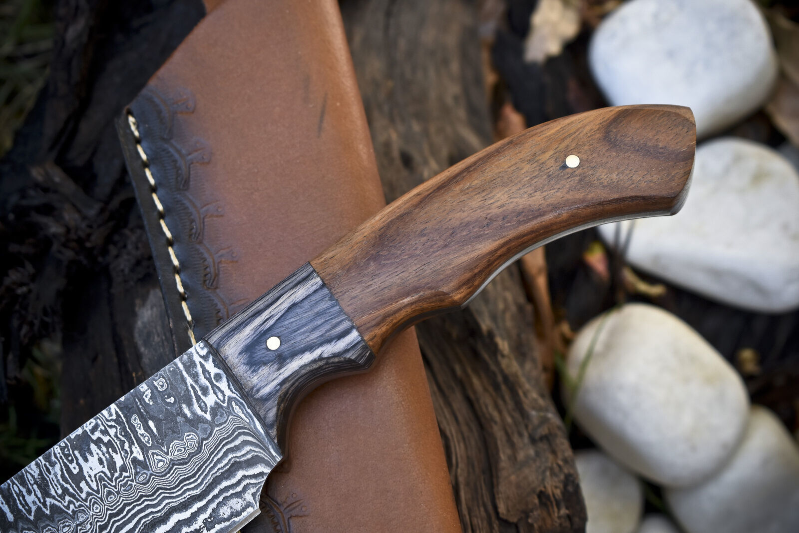 This hand forged ladder Damascus skinner knife walnut wood handle outdoor hunting tool is built for precision and durability, making it a reliable companion for hunters, skinners, and outdoor enthusiasts. With an overall length of approximately 9.5 inches, this handmade fixed blade knife features a 5-inch cutting edge and a comfortable 4.5-inch walnut wood handle, perfectly balanced for field use.