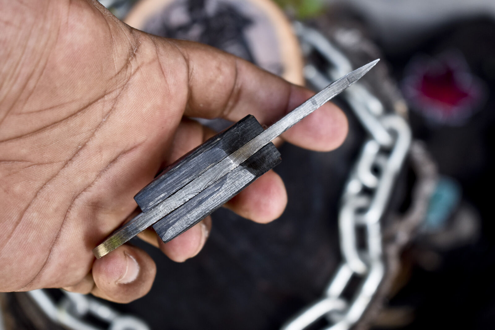 This Hand Forged Ladder Damascus Skinner Knife is a compact yet powerful tool, designed for camping, skinning, and outdoor adventures. Measuring 4 inches overall, it features a 1.5-inch wide, rigid blade that is oil tempered to 58–60 HRC for exceptional durability and edge retention. Crafted from premium 1095 and 15N20 high-carbon steel, the blade is folded repeatedly to create 512 distinct layers, revealing a striking ladder Damascus pattern with crisp, polished lines that catch the light beautifully. The solid hardwood handle offers a secure, comfortable grip, making it ideal for precision skinning or detailed camp tasks. The knife comes with a high-quality, hand-tooled leather sheath—double-stitched for strength—ensuring safe carry and long-lasting performance. Fully handmade in Pakistan without CNC machining or precut blanks, each piece is unique, reflecting true artisanal skill. Whether used in the field or added to your collection, this ladder Damascus skinner is both functional and visually stunning, making it an essential tool for hunters, campers, and collectors alike.