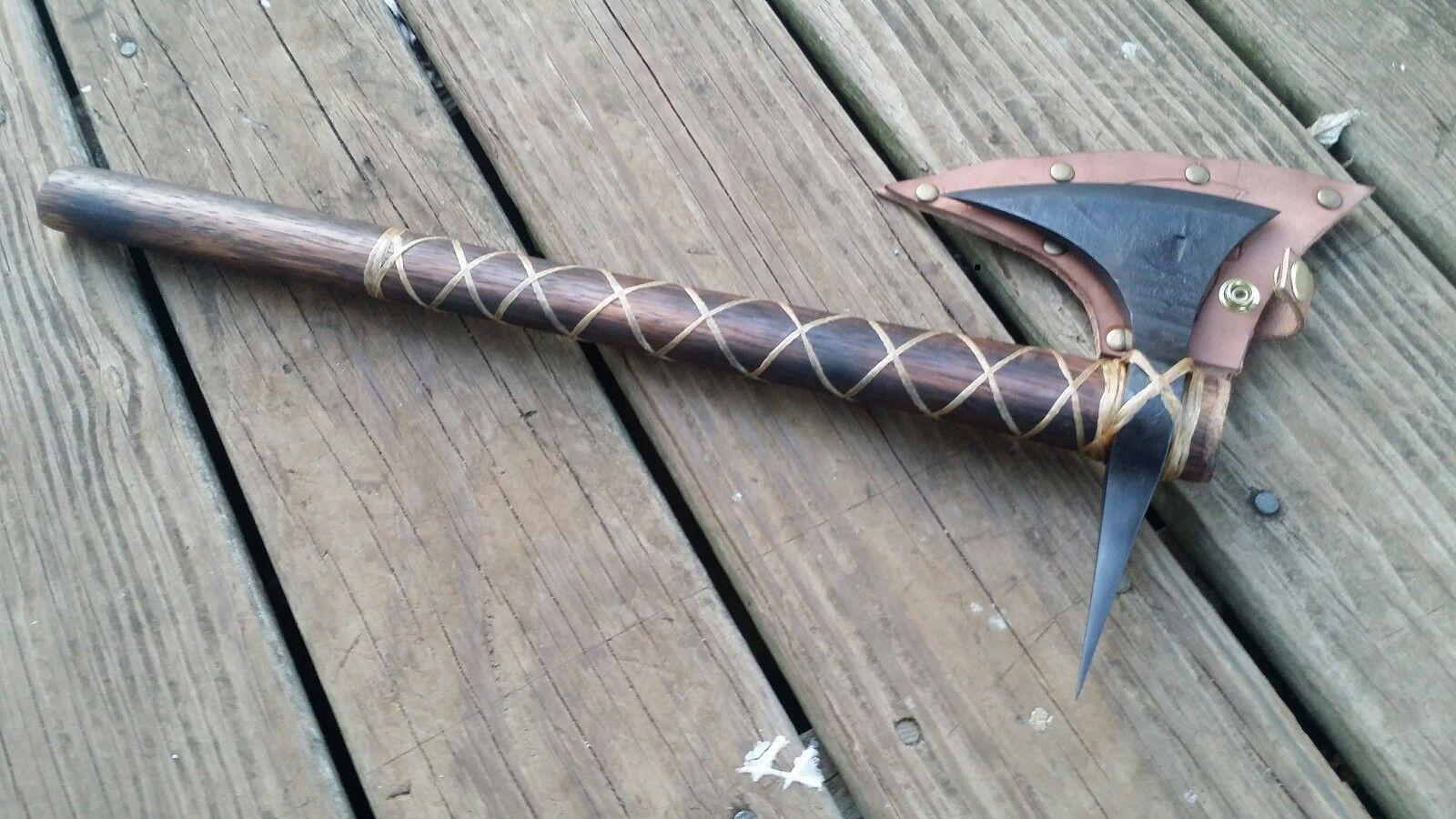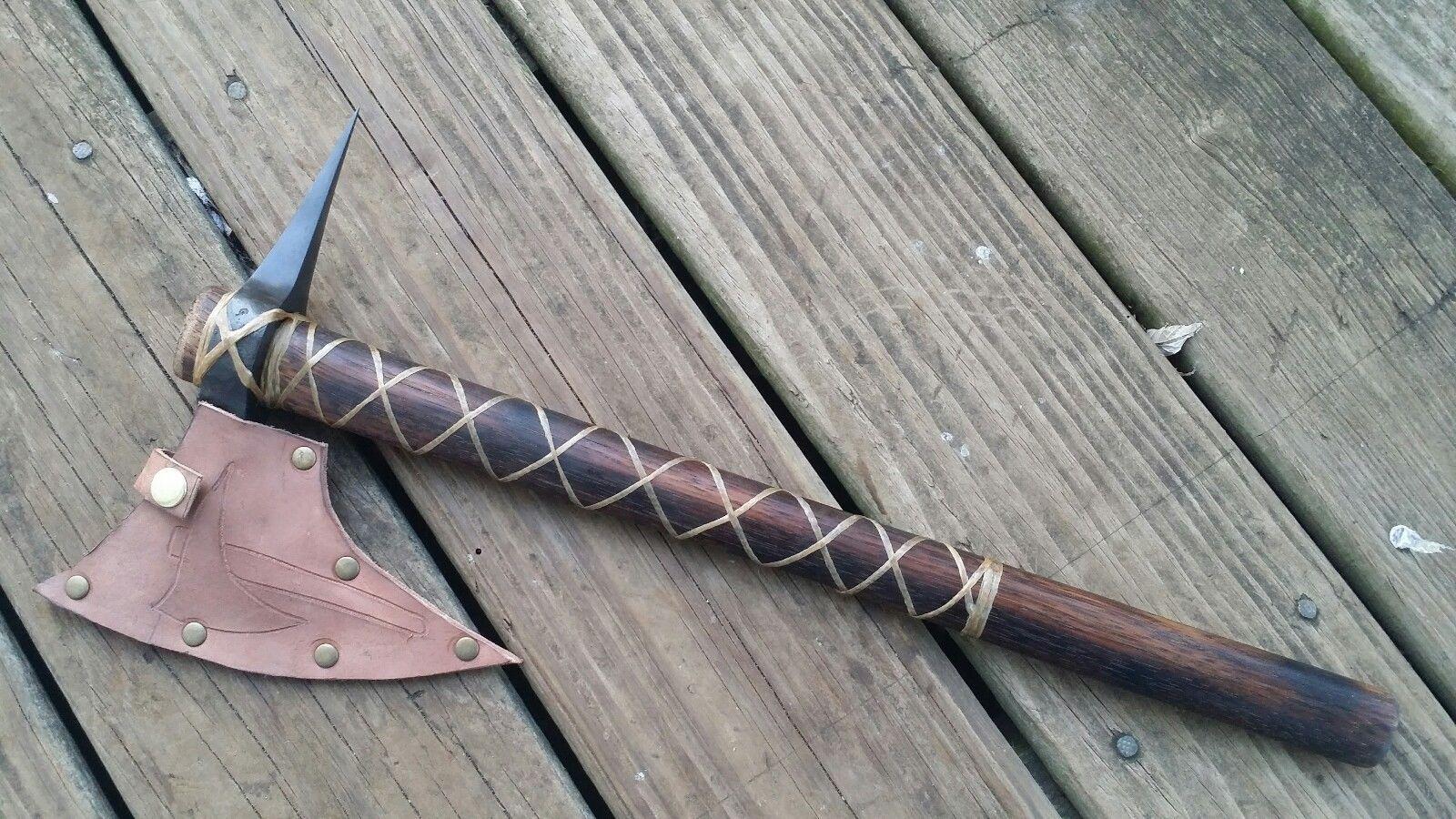 This Hand-Forged Norse Spike Tomahawk Viking Axe is a powerful and authentic piece inspired by traditional Viking weaponry. Crafted from 4140 chrome moly steel, the axe head has been normalized, hardened, and tempered for superior durability and strength. Its forged finish reflects true craftsmanship, giving it the rugged, battle-ready appearance associated with Viking warriors.The axe measures 19 inches in total length, offering an ideal balance for both display and functional outdoor use. The 5-inch cutting bit provides excellent chopping capability, while the extended spike design adds versatility for piercing or tactical applications. The head is securely mounted to a flame-colored hickory handle that is treated with boiled linseed oil to enhance its natural resilience and grain pattern. A black paracord wrap is added for improved grip, along with an adjustable lanyard for secure handling during use.