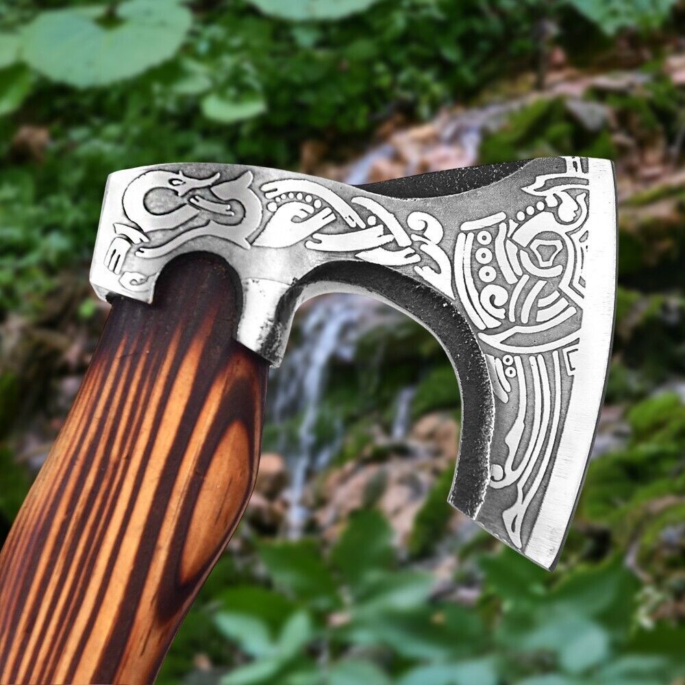 Each axe is fully handmade, with no pre-bought parts, ensuring every piece is unique. It comes complete with a custom leather sheath for protection and portability. Perfect as a replica viking axe for display, a practical viking combat axe for reenactments, or a meaningful gift, this battle ready viking axe blends Norse mythology with modern craftsmanship. Strong, reliable, and authentic, it honors the legacy of the Viking Age.