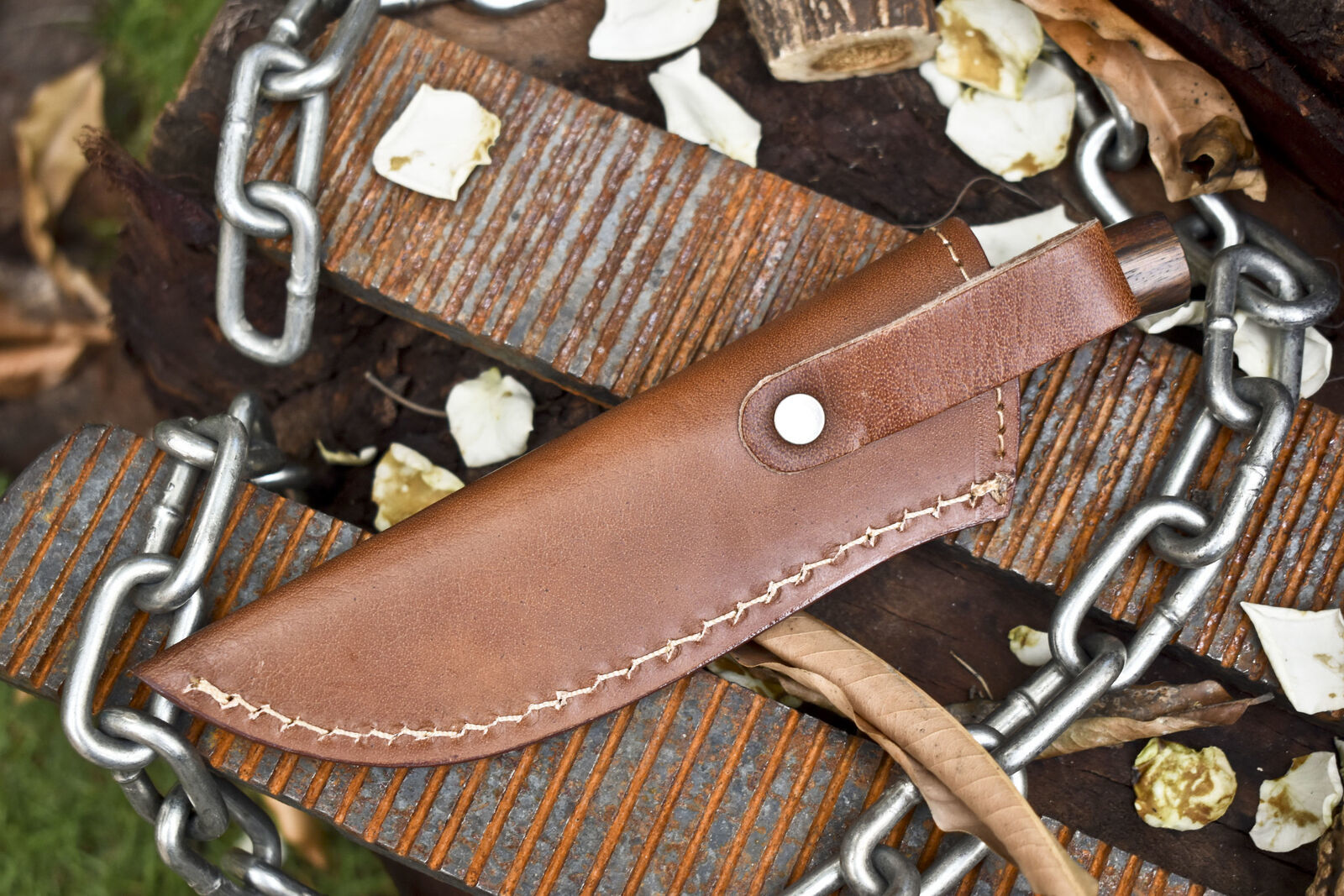 Each knife is entirely handmade, ensuring no two pieces are identical, with natural wood grain variations and unique Damascus designs. A hand-stitched, heavy-duty leather sheath is included, providing protection and portability for field carry.