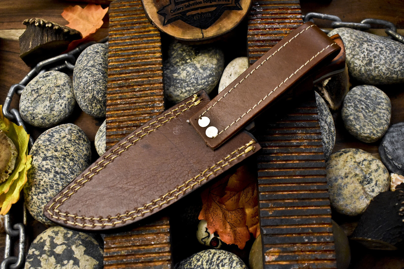 This damascus skinner knife features an overall length of approximately 10 inches, with a 5-inch blade and a 5-inch handle crafted from a unique blend of bone and wood, enhanced by a wooden bolster. The blade is hand forged from a mix of 1095 and 15N20 steel, repeatedly folded and acid-etched to reveal the exquisite rain drop pattern. This pattern resembles raindrops gently falling on water, creating flowing wavy lines that shimmer with a polished finish, offering both beauty and strength. The blade is oil tempered to 58-60 HRC, ensuring durability and a sharp, rigid edge perfect for professional skinning tasks. This knife is ideal for hunters and outdoor enthusiasts who require precision and reliability. The included thick, hand-tooled leather sheath is designed for rugged use, making it a durable companion in the field. Handmade with care in Pakistan, each knife is unique, showcasing handcrafted characteristics that set it apart. This knife combines timeless artistry and modern functionality in one elegant, practical tool.