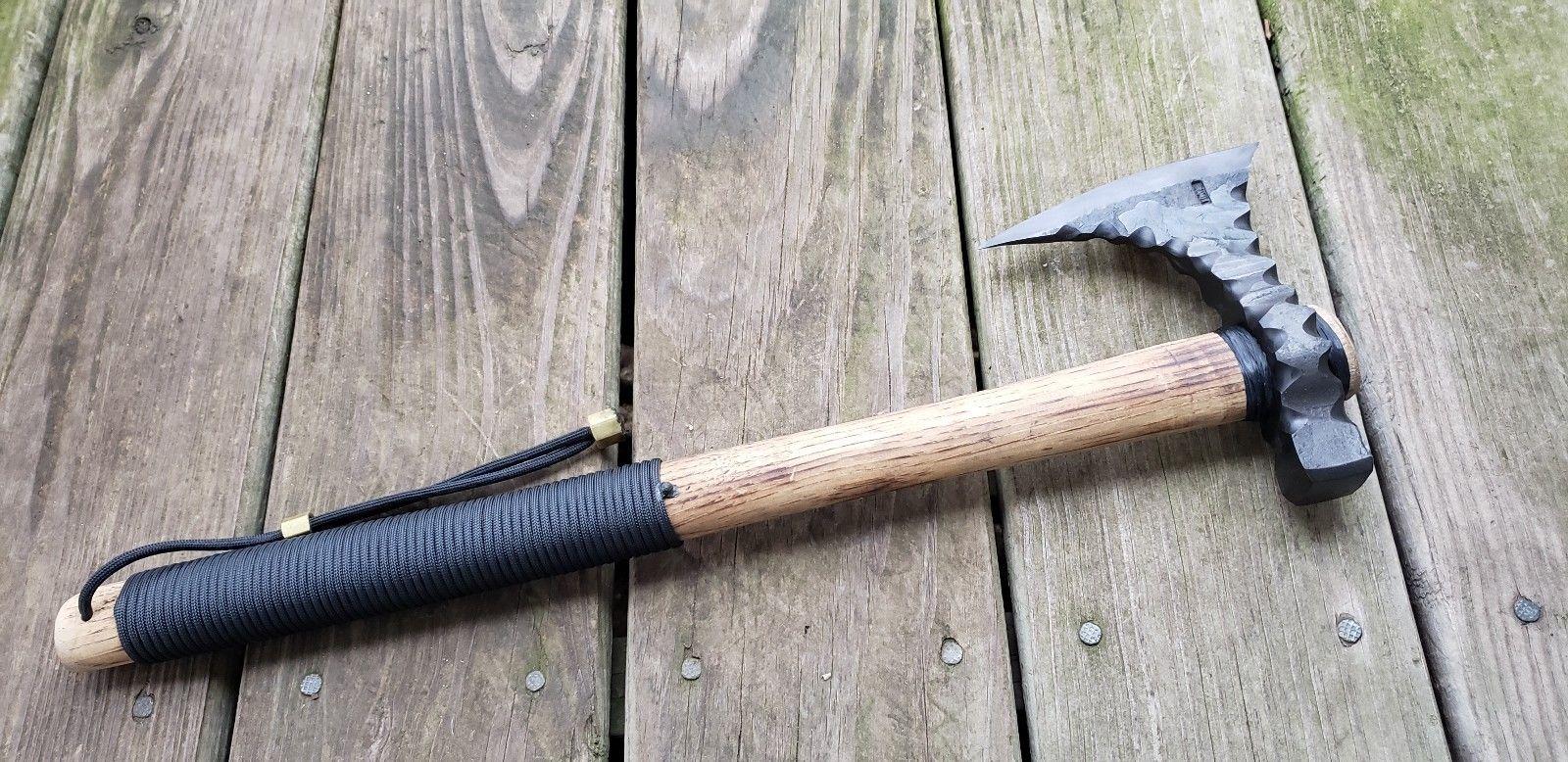 This Hand-Forged Tomahawk Camp Hammer Poll Viking War Axe is a versatile and durable piece, carefully crafted to combine traditional Viking-inspired design with modern forging techniques. Made from 1-inch square 4140 chrome moly steel, the axe head has been normalized, hardened, and tempered to deliver outstanding toughness and cutting performance. The forged finish adds a rugged, authentic look, echoing the weapons once wielded by Viking warriors.The axe measures 19 inches in total length and weighs 1 lb. 10.6 oz., making it well-balanced for both practical use and display. The 5.75-inch cutting bit provides excellent chopping power, while the hammer poll design on the opposite side makes it ideal for driving stakes, splitting, or general camp tasks. The handle is crafted from flame-colored hickory, finished with boiled linseed oil to enhance durability and highlight its natural grain. For improved grip and control, the handle is wrapped in black paracord and fitted with an adjustable lanyard.