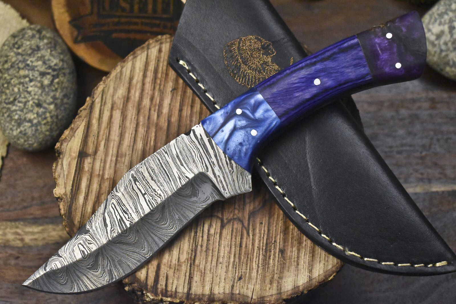 Each damascus acid etched fixed skinner knife showcases a stunning swirl pattern, created by folding layers of steel and etching them to reveal vibrant contrasts between deep blacks and bright silvers. The result is a blade that is not only hard and tough but visually striking.