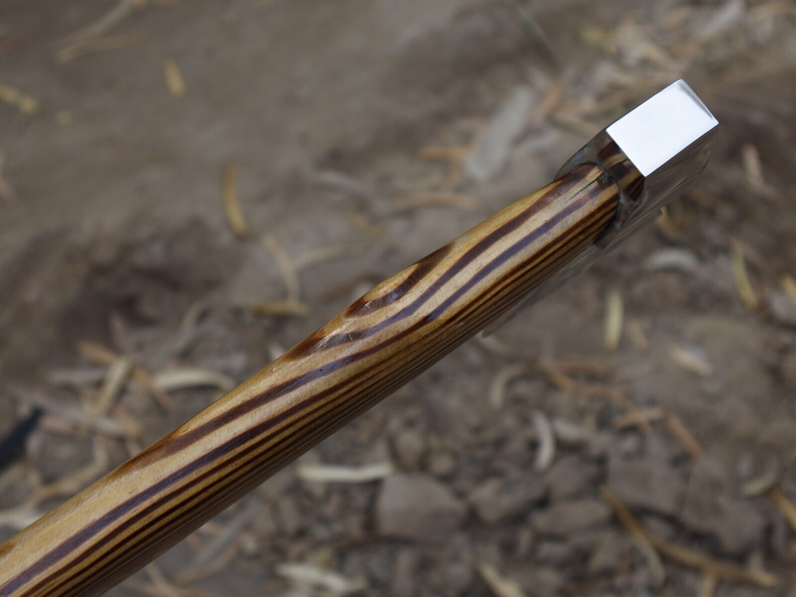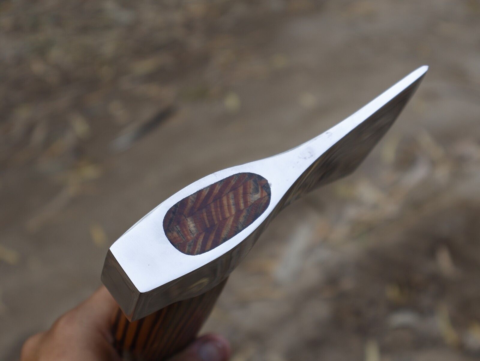 This hand forged Viking tomahawk is a striking blend of traditional craftsmanship and modern durability. Crafted from high-quality carbon steel, the axe blade is hand forged with over 270 layers of 1095 and 15N20 steel, finished with a nickel layer. Expert heat treatment gives the blade a hardness of 56–57 HRC, ensuring a razor-sharp cutting edge, excellent strength, and long-lasting edge retention.The axe features an overall length of 16 inches, with a 3.5-inch cutting edge and a 6-inch wide blade head, making it versatile for chopping, splitting, or detailed woodwork. The yellow pine ash wood handle is hand carved, engraved, and designed for durability and comfort. Its ergonomic grip allows for secure handling, whether used for outdoor bushcraft, hunting, or as a decorative piece inspired by Viking tradition.A high-quality hand-stitched leather sheath is included, providing safe storage and easy portability. This handmade tomahawk is more than just a tool—it’s a piece of functional art that embodies the spirit of Norse warriors. Perfect for collectors, outdoor enthusiasts, or as a unique gift for special occasions.