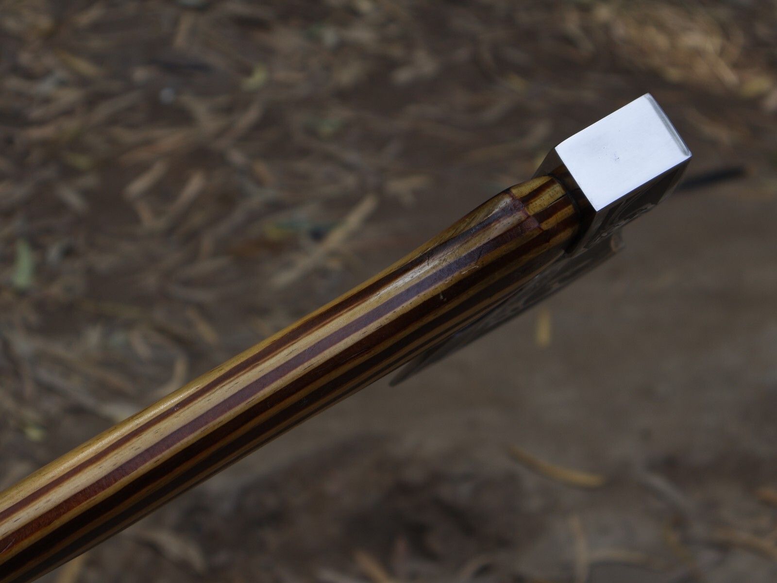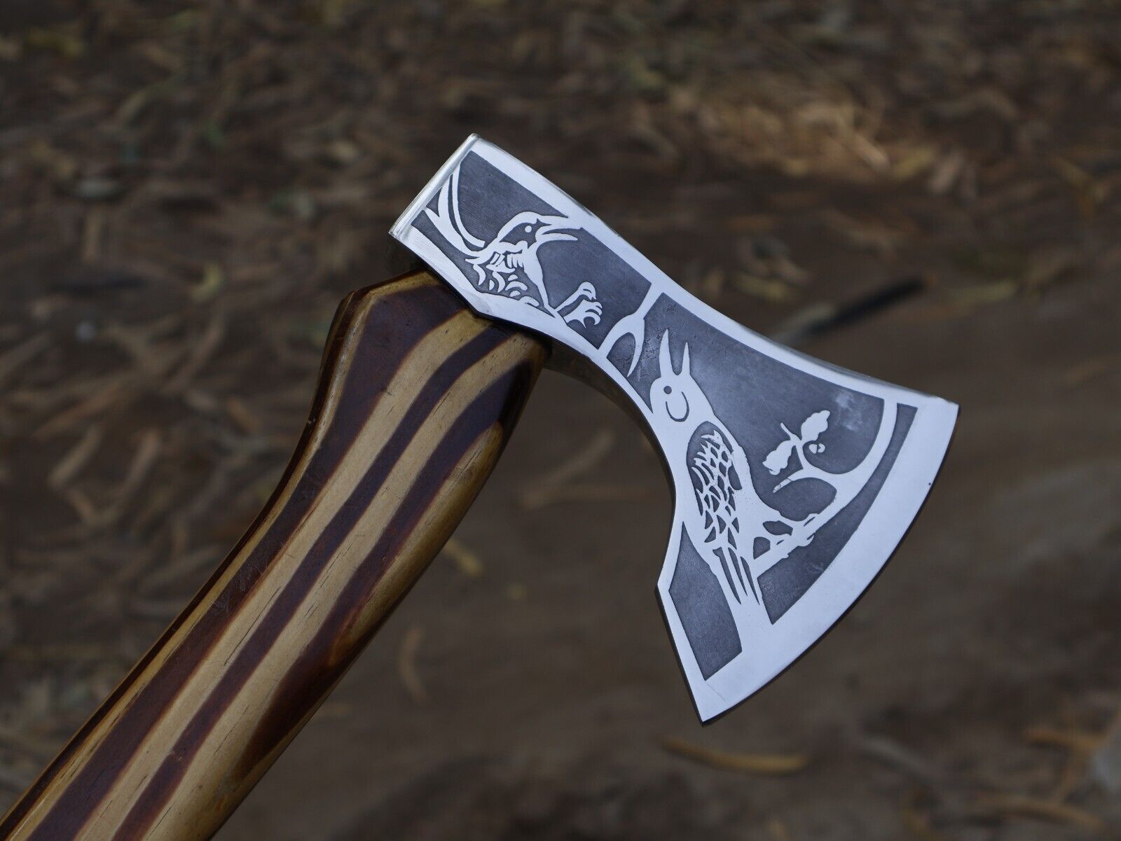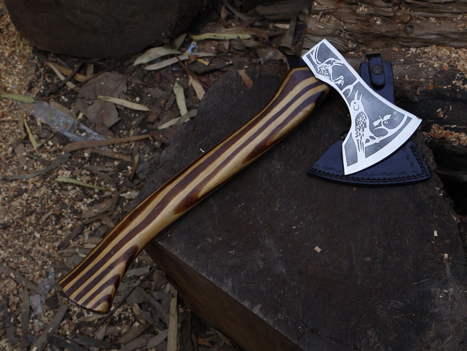This hand forged Viking axe is a remarkable combination of strength, function, and traditional craftsmanship. Forged from high-quality carbon steel, the blade is created with over 270 layers of 1095 and 15N20 steel, reinforced with a nickel layer. It undergoes expert heat treatment, achieving a hardness rating of 56–57 HRC, making it durable, sharp, and resilient for repeated use.The axe measures 18 inches in overall length, with a 4.5-inch cutting edge and a 6.5-inch blade width, giving it excellent balance and versatility. The ash wood handle is hand carved and engraved, providing both strength and an ergonomic grip for comfort and control. Whether used for chopping, splitting, or display, this axe reflects the heritage of Viking battle axes while offering modern usability.A hand-stitched leather sheath accompanies the axe, ensuring safe storage and easy carry. This handmade tomahawk is not only a dependable outdoor tool but also a striking decorative piece that embodies the artistry of Norse design. Perfect for hunting, camping, bushcraft, or as a unique gift for collectors and enthusiasts of Viking culture.