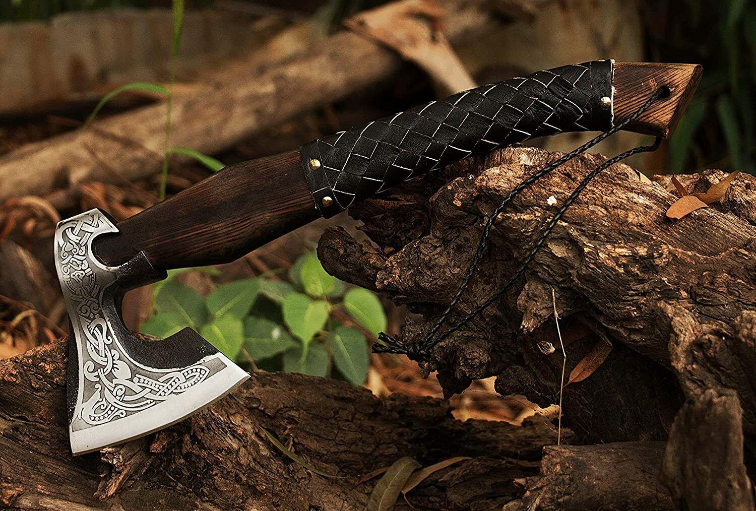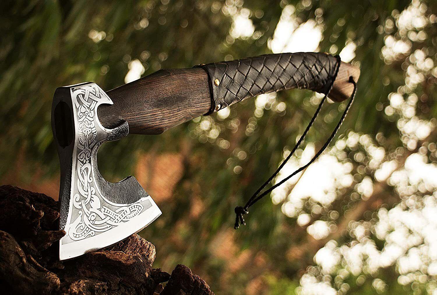 Hand Forged Viking Axe – Carbon Steel Tomahawk Hatchet with Ash Wood Handle and Leather Sheath