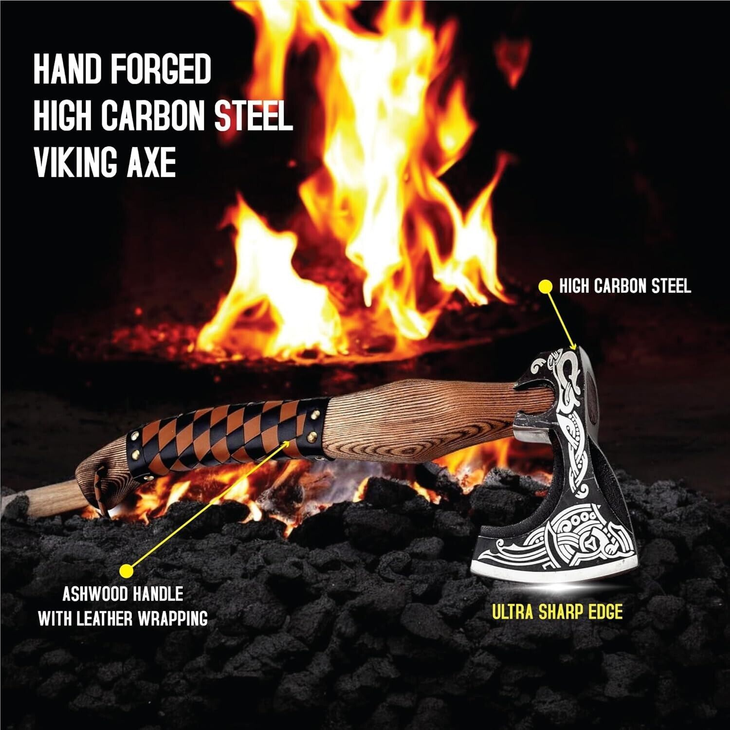 This handcrafted viking axe is forged from premium high carbon steel, designed for durability, precision, and authentic Norse style. Measuring an overall length of 19 inches with a 6-inch axe head and a razor-sharp 5-inch cutting edge, this hunting axe offers both power and control. Inspired by traditional war axe viking craftsmanship, it delivers exceptional performance while also serving as a stunning collectible.