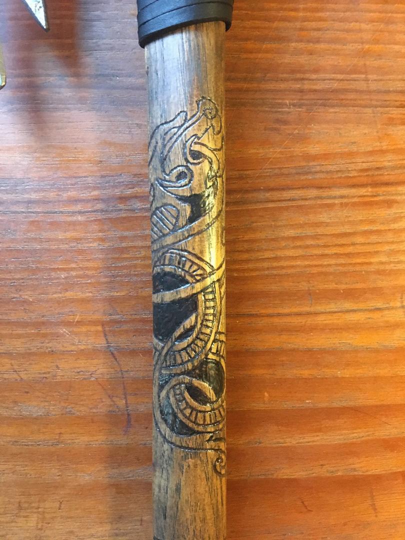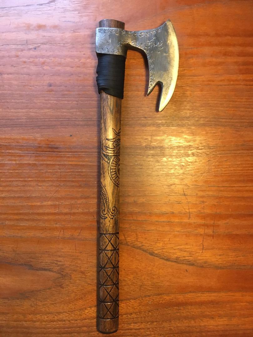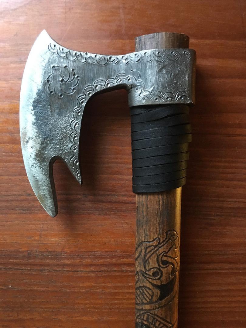 Step into the world of Norse warriors with this one-of-a-kind Hand-Forged Viking Battle Axe. Each axe is custom crafted by skilled artisans, making every piece unique. The high-quality steel head is tightly fitted to the 18-inch hickory handle without pins or glue, ensuring durability and authentic construction. The handle is hand-carved with intricate designs and treated with linseed oil to protect the wood while enhancing its natural beauty.The leather-wrapped handle is tightly whipped, providing a secure grip and aesthetic appeal, perfect for chopping, splitting, throwing, or outdoor survival tasks. Compact yet powerful, this axe is ideal for camping, bushcraft, and even as a collectible piece for Viking enthusiasts. Whether for practical use or display, it embodies the spirit of the Norse warrior and the artistry of traditional blacksmithing.