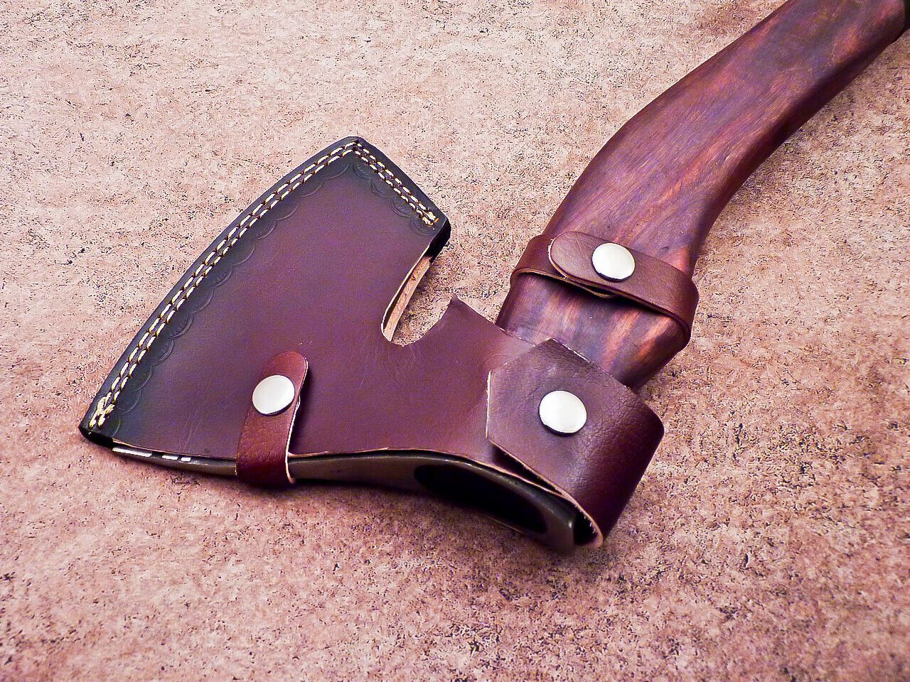 The 16.5-inch natural wood handle, bound with genuine cowhide leather, offers a comfortable grip and traditional appearance. The axe head has been carefully hand ground, heat treated, and given an antique patina finish, enhancing its Viking-inspired design. Ideal for camping, bushcraft, throwing, or display, this tomahawk is built to perform and impress.