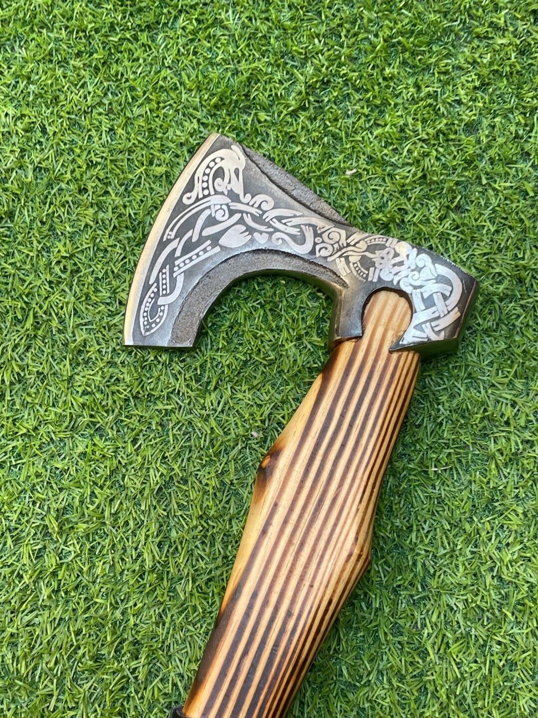 The multi-color wooden handle offers a secure, ergonomic grip for ambidextrous use, while the handmade design showcases authentic Viking artistry. This axe comes complete with a durable leather sheath, making it a perfect gift for collectors, outdoor enthusiasts, or anyone who appreciates historical weaponry. Reliable, functional, and visually striking, this axe blends tradition with modern performance.