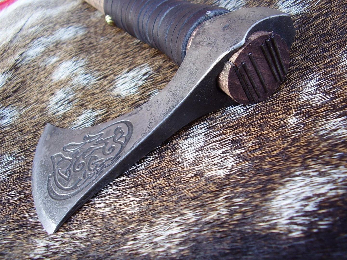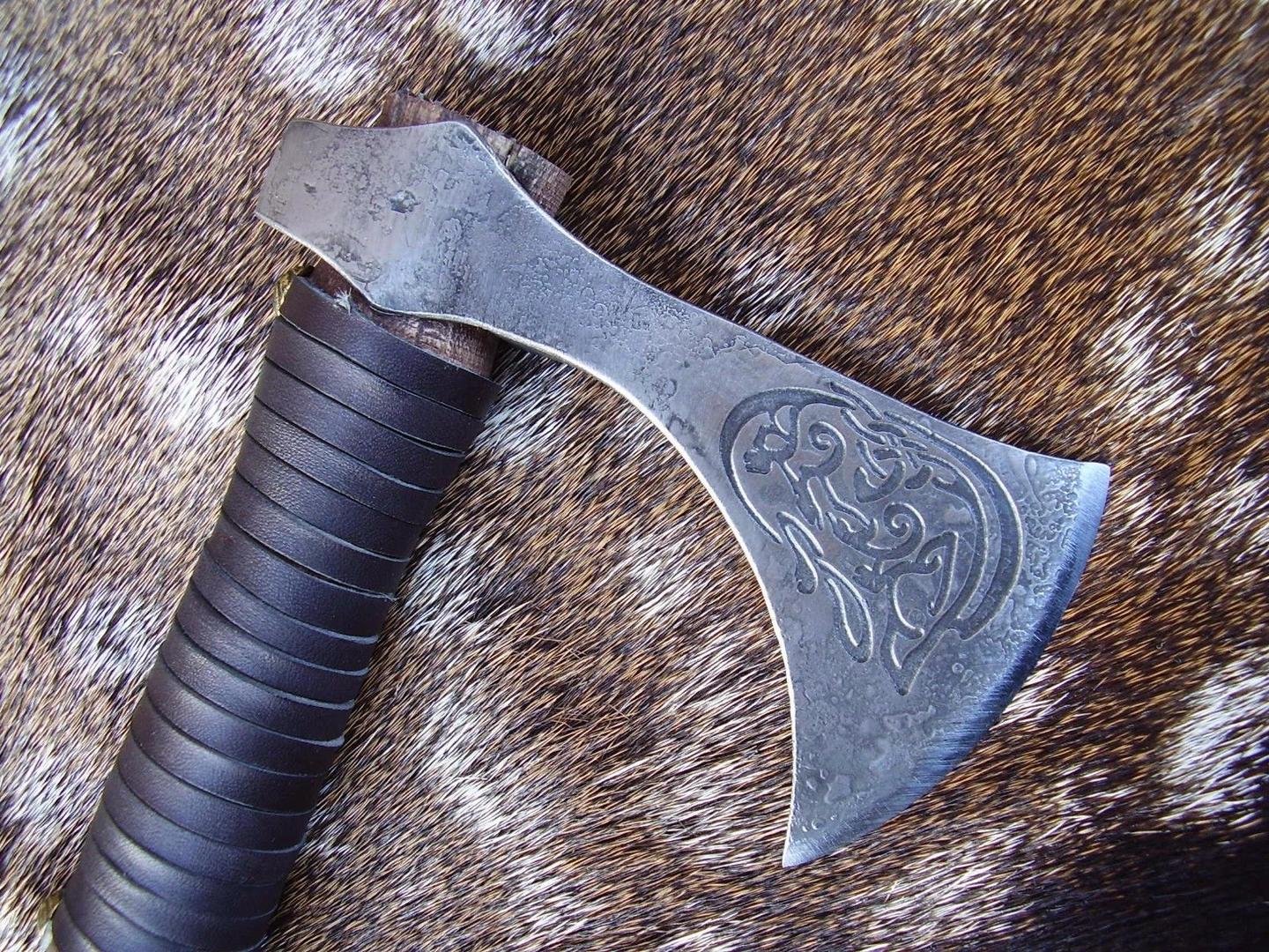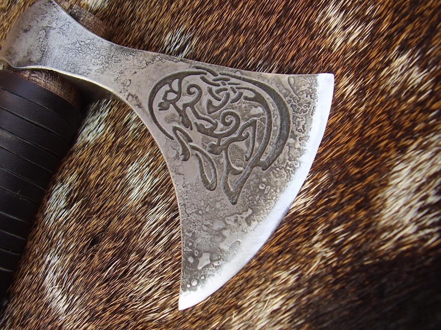Hand-Forged Viking-Style Carved Tomahawk | Bushcraft Hatchet with Hardened Edge
