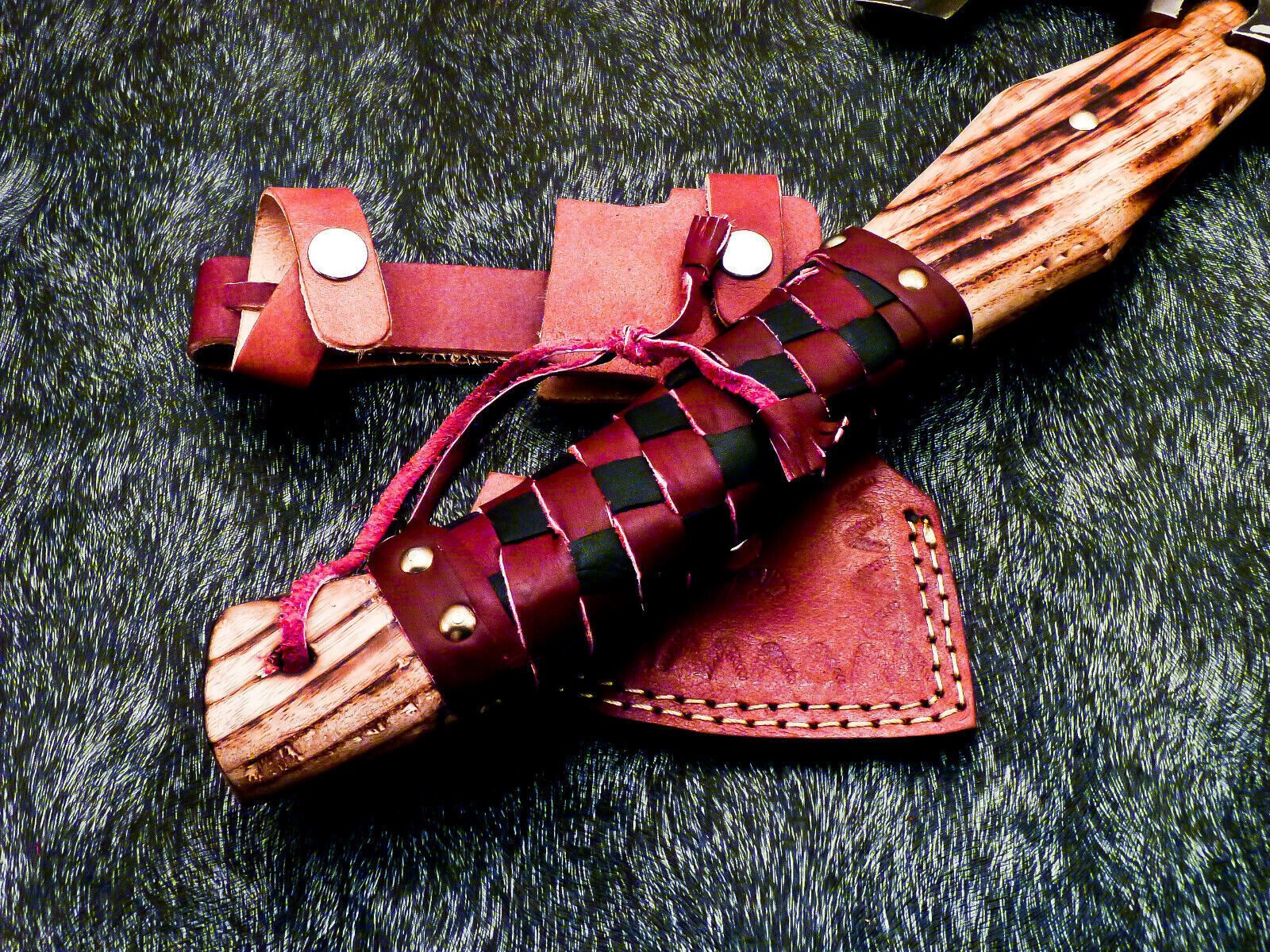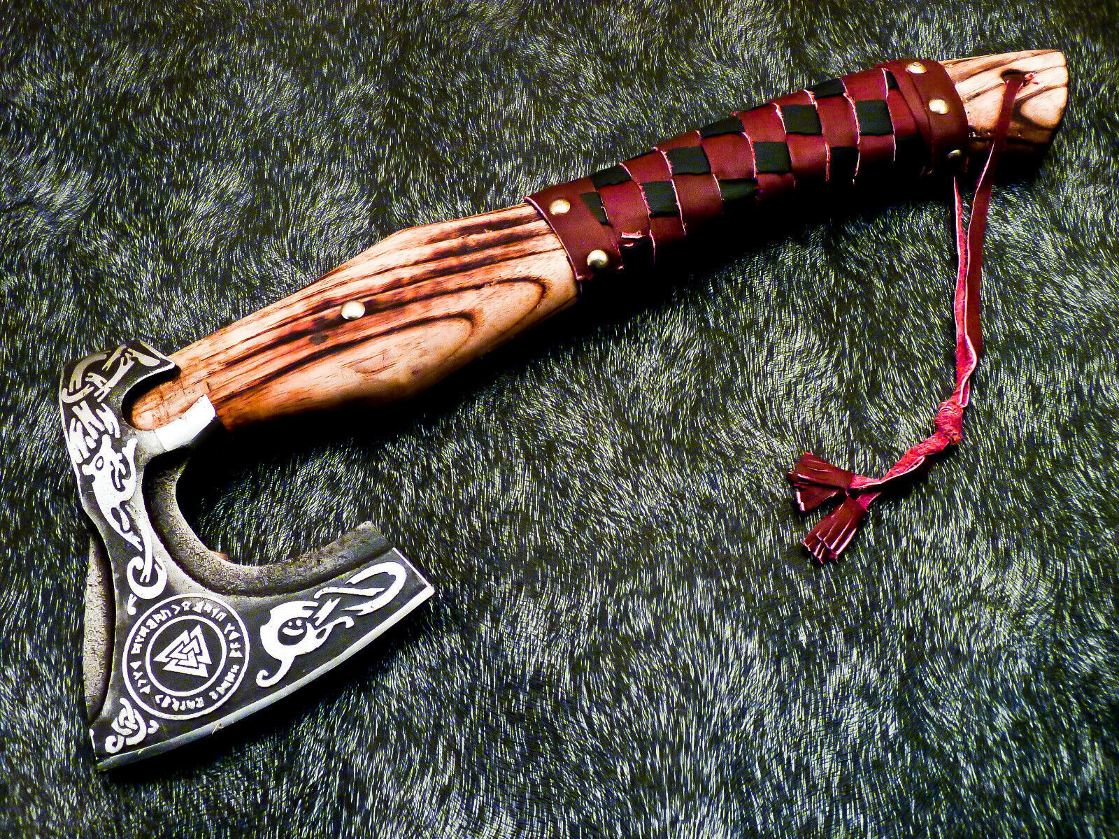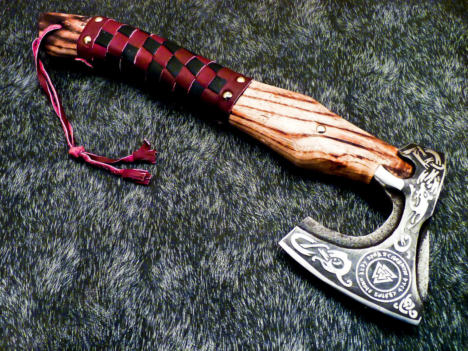 Step into the world of Norse warriors with this Hand Forged Viking Warrior Berserker Axe, a compact yet powerful collectible designed for enthusiasts and history buffs. Measuring approximately 14 inches in overall length with a 4-inch cutting blade and 5-inch blade width, this axe is ideal for display, cosplay, or light functional use. The handle is crafted from premium natural wood and bound with cowhide leather, providing a secure grip and an authentic Viking aesthetic. The high carbon steel blade is fully hand forged and finished with an antique patina, giving each piece a distinct handcrafted character while retaining exceptional sharpness. Every axe comes with a premium cowhide leather sheath featuring a belt loop for safe storage or convenient carry. Designed as a bearded hatchet, this versatile axe reflects the artistry, tradition, and practicality of Viking weaponry, making it a perfect gift for collectors, reenactors, or anyone inspired by Norse heritage. Each axe is unique, with subtle variations that highlight the craftsmanship of skilled artisans. Whether used as a functional tool, a striking decorative piece, or part of a historical collection, this Viking axe combines durability, beauty, and authenticity in one exceptional design.