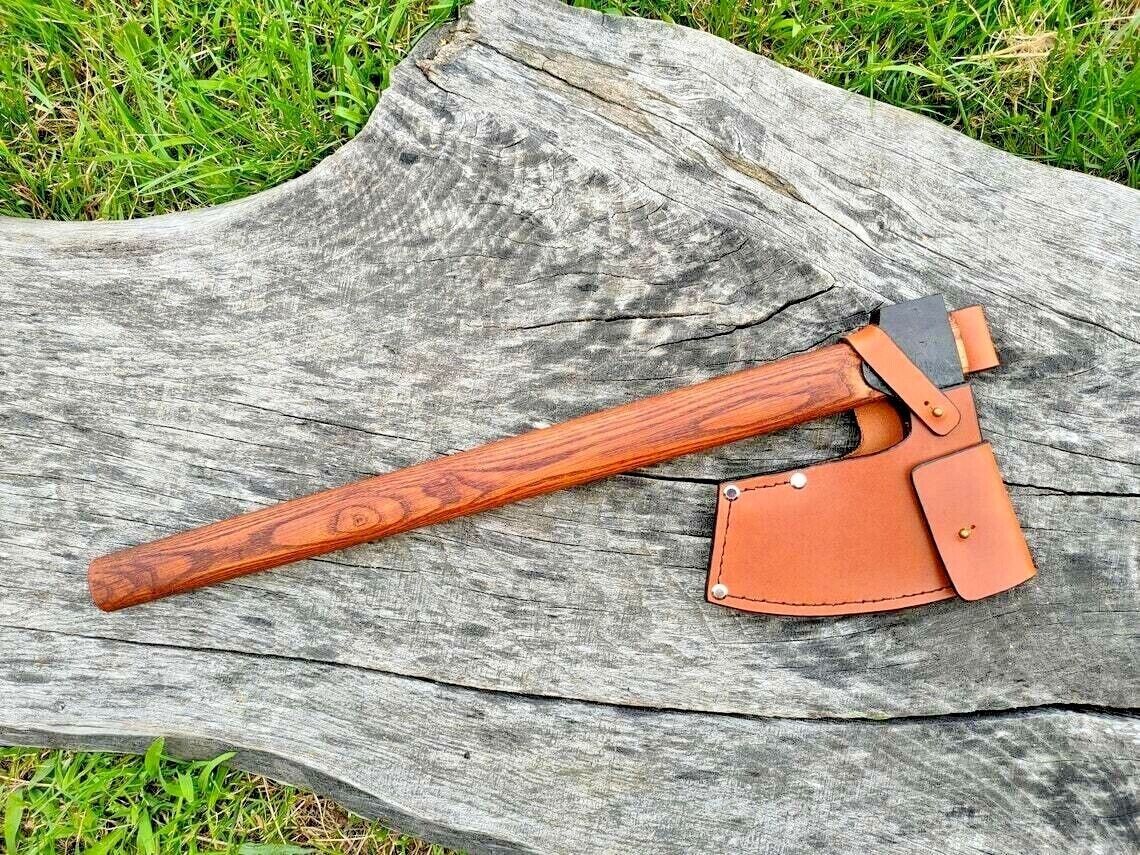 This hand made carbon steel viking axe is a masterpiece of craftsmanship and functionality, designed for both collectors and outdoor enthusiasts. Measuring 19 inches in overall length with an 18-inch handle, this viking combat axe offers the perfect balance of weight and control, making it ideal for hunting, camping, and outdoor adventures. The high-quality carbon steel blade is inspired by viking battle axes and viking fighting axe designs, providing a sharp, durable edge that lasts for years. Its full tang construction and sturdy wooden handle ensure strength, comfort, and reliable performance. The design incorporates elements reminiscent of viking dane axe and viking crossed axes, capturing the authenticity of historical vikings battle axe styles. With a cold steel axe head cane inspired finish, this piece also appeals as a collectible, reflecting the artistry of steel city axes and the steel woods axe. The included leather sheath protects the blade, making it safe and convenient for transport. Perfect as a two handed viking axe replica, this viking war axes tool is both functional and visually striking, ideal for enthusiasts seeking a unique, historically-inspired piece for their collection or outdoor gear.
