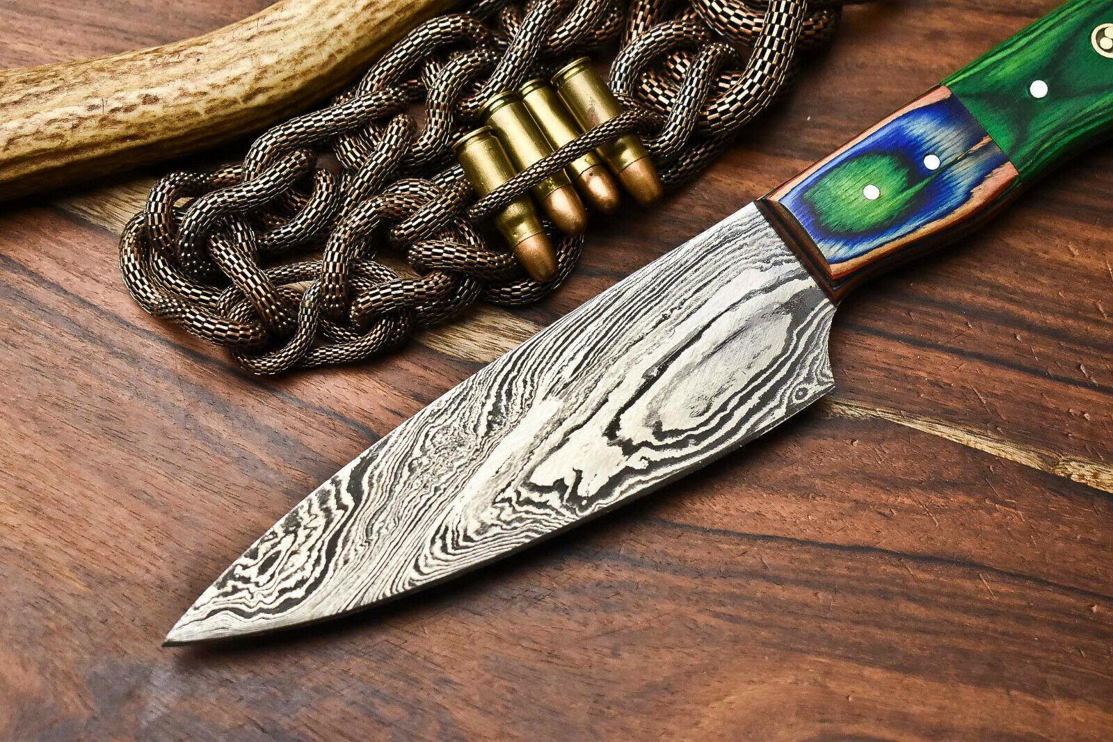 This Hand Made Damascus Steel Chef Knife combines precision, durability, and style. The blade is crafted from high-quality Damascus steel, made by folding 1095HC and 15N20 nickel carbon over 384 layers, then acid-etched to reveal its striking patterns. Heat-treated and oil-tempered to 58-60 HRC, it delivers excellent sharpness and long-lasting edge retention. The knife features a full tang design with a polished hard wood handle for a comfortable, secure grip. Each knife is 100% handmade, ensuring unique craftsmanship with every piece. Perfect for chopping, slicing, and general kitchen tasks, this knife blends functionality with artistry, making it a standout tool for professional chefs and home cooks alike.