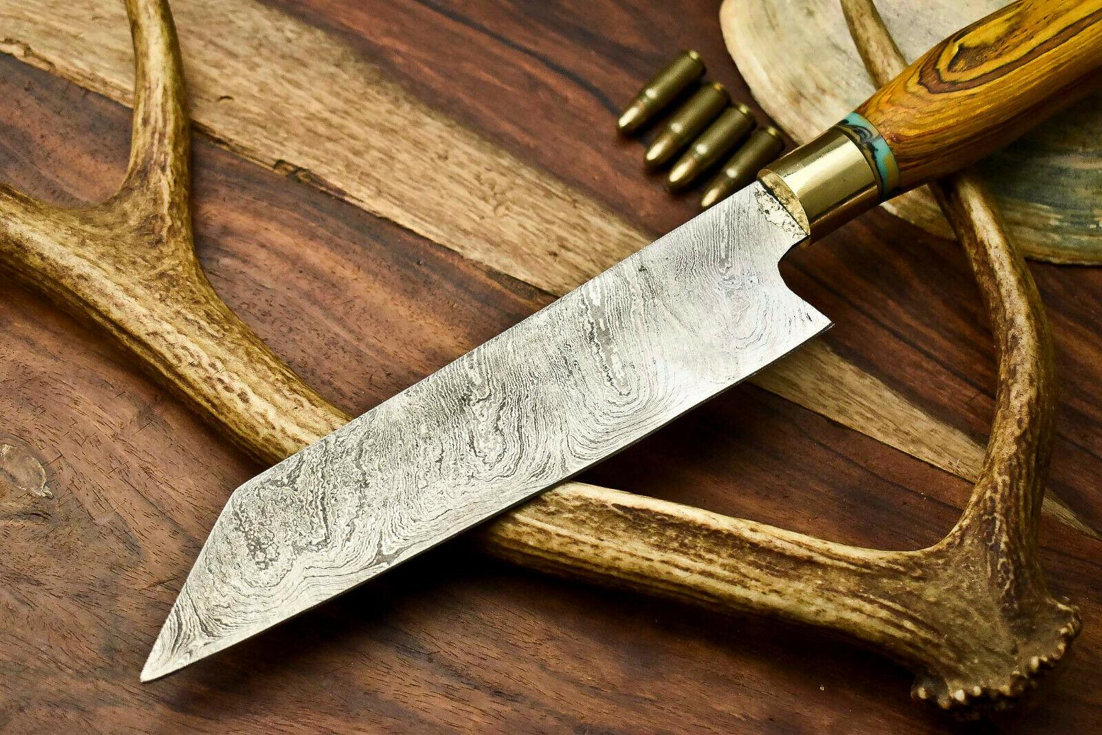 This hand made Damascus steel chef knife features a full tang design with a durable hard wood handle for a comfortable and secure grip. The blade is crafted from 1095HC and 15N20 nickel carbon steel, folded 384 times to create authentic Damascus patterns. Acid-etched to reveal the layers, each blade is high-polished for a satin finish. Oil tempered to 58–60 HRC and sharpened at a 20-degree angle, this knife ensures exceptional cutting performance for chopping, slicing, and dicing. The knife comes with a high-quality cowhide leather sheath. Every knife is 100% handmade, offering a unique and professional-grade tool for both chefs and cooking enthusiasts.