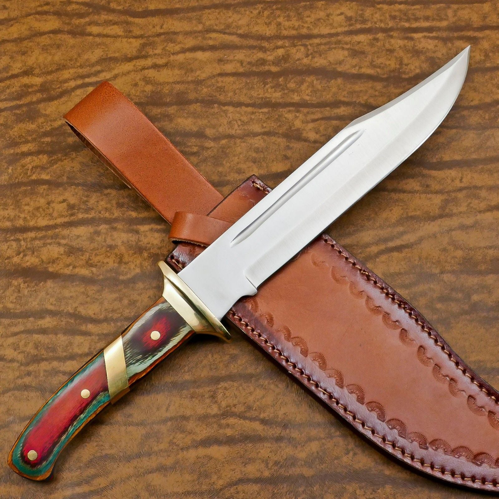 Take your outdoor adventures to the next level with this handcrafted 12-inch D2 steel full tang Bowie hunting knife, featuring a premium Pakka wood handle. Designed for hunters, campers, survivalists, and knife collectors, this knife combines strength, precision, and durability in a versatile tool built to last. The D2 tool steel blade delivers exceptional hardness, superior edge retention, and remarkable wear resistance, making it ideal for slicing, chopping, piercing, and skinning during hunting, camping, or survival activities. Its classic Bowie-style design ensures dependable performance across a wide range of outdoor tasks.The full tang construction guarantees maximum balance, strength, and stability, allowing the knife to endure heavy-duty use in rugged conditions. The ergonomically crafted Pakka wood handle offers a secure, comfortable grip while reducing hand fatigue during prolonged use, adding both elegance and functionality. Each knife is meticulously handmade by skilled artisans, giving it a unique character that distinguishes it from mass-produced alternatives. A custom leather sheath is included for safe storage and easy portability, making this Bowie knife ready for immediate use. Rugged, reliable, and beautifully crafted, this 12-inch D2 steel full tang Bowie hunting knife with Pakka wood handle is an essential addition to any outdoor enthusiast’s or collector’s toolkit.