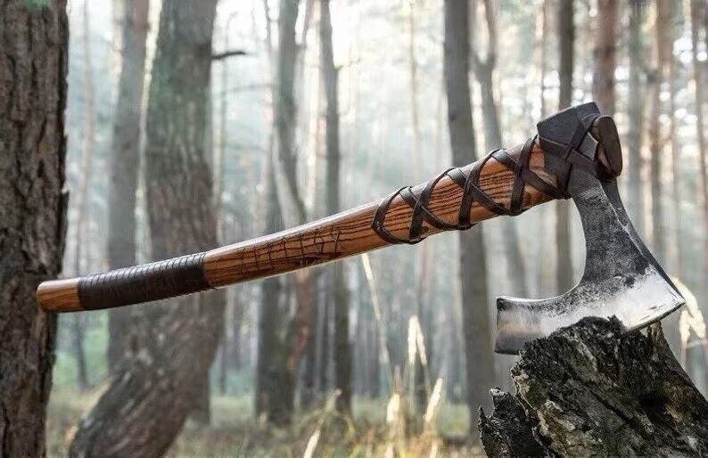 Experience the perfect blend of traditional craftsmanship and functional design with this handcrafted Viking Bearded Hatchet Tomahawk Axe. Measuring 26 inches in handle length with a 7-inch axe width and a 6.5-inch cutting edge, this premium Viking axe is built for both collectors and outdoor enthusiasts. The hand-forged carbon steel blade ensures exceptional sharpness and durability, while the solid wood handle provides a secure and comfortable grip. Each axe comes with a complimentary leather sheath, offering protection and easy transport. The intricate design and bearded blade style reflect Norse heritage, making this axe not only a practical tool for chopping and camping but also a striking display piece. Whether used for bushcraft, tactical purposes, or as a collector’s item, this Viking battle axe embodies both tradition and functionality. For any further inquiries, you can reach out directly for personalized assistance.