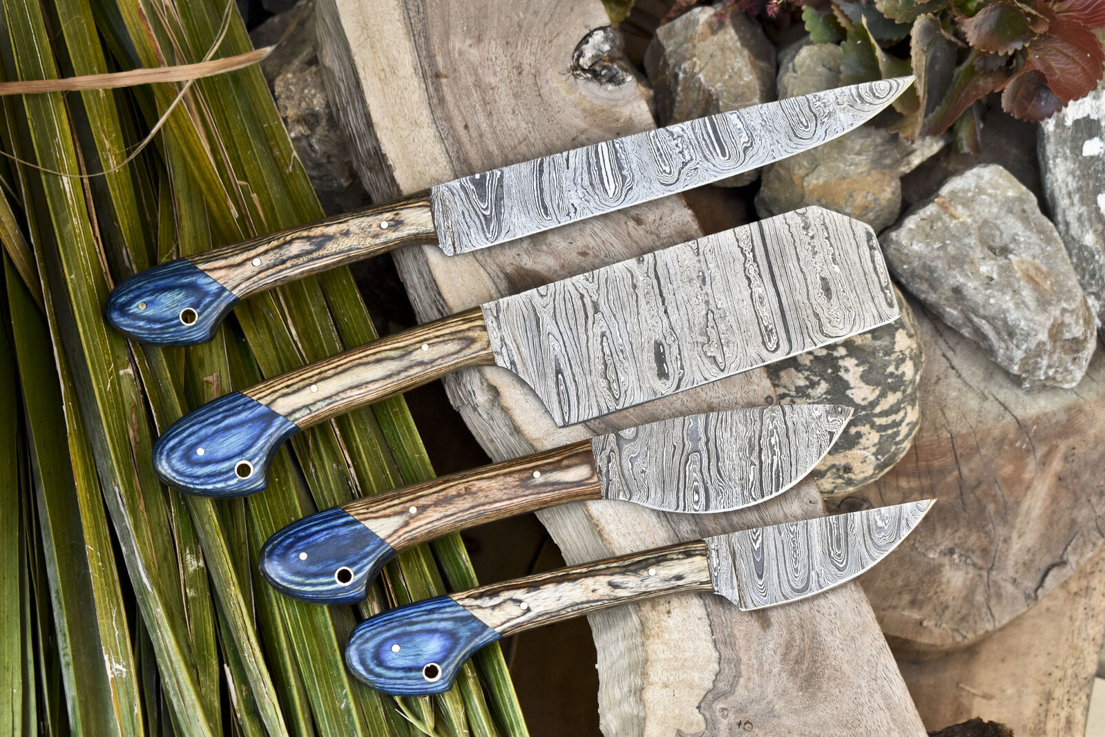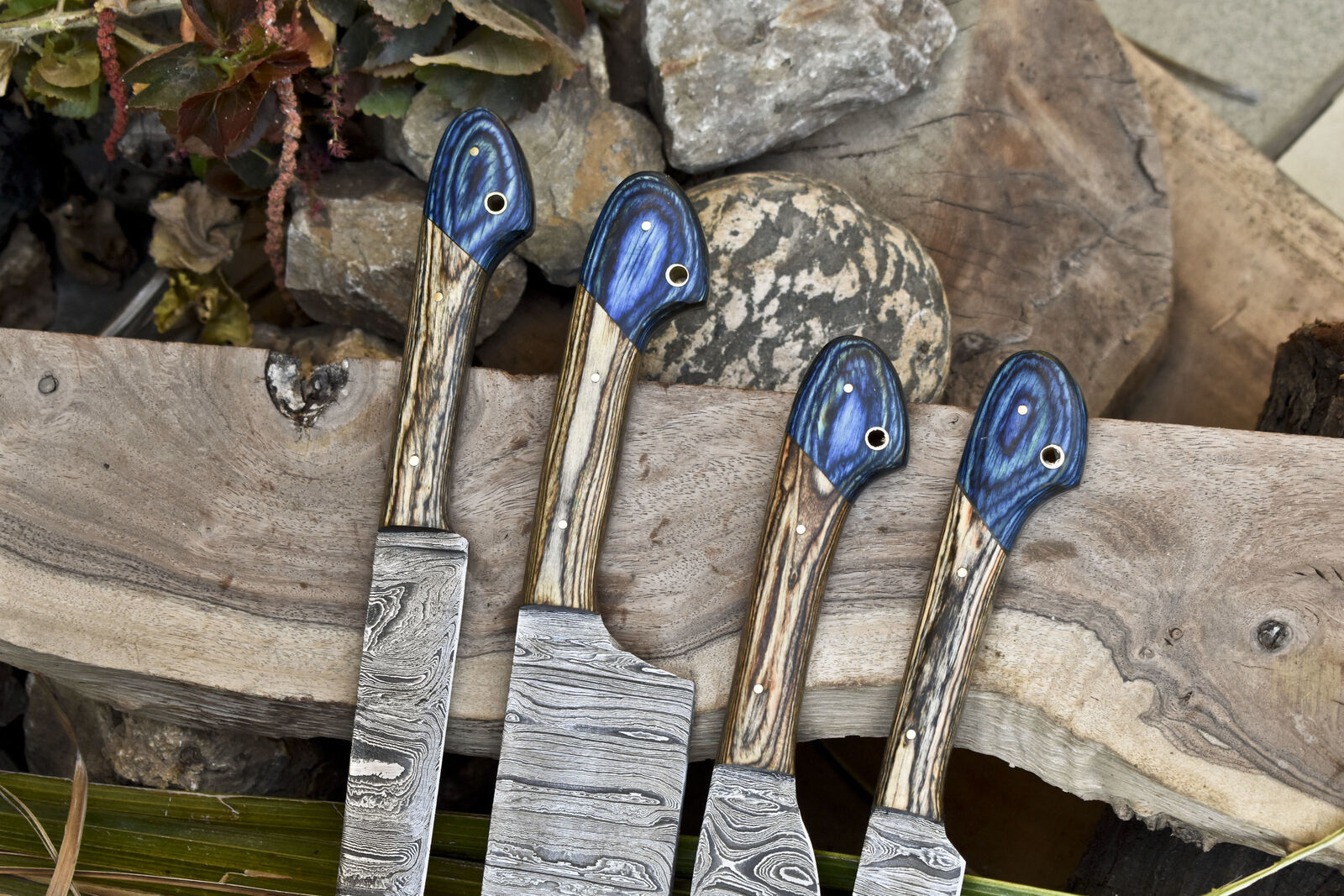 Handcrafted Damascus Chef Knife Set of 4 – Ash Wood Handle, 13" Full Tang Kitchen Knives