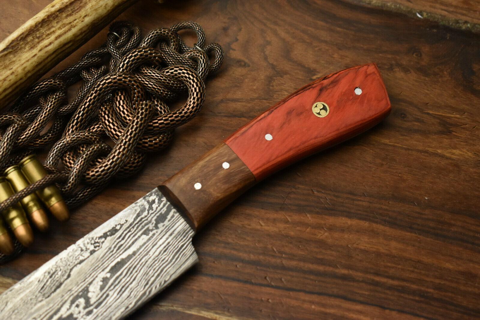 This Handcrafted Full Tang Damascus Steel Chef Knife is a perfect combination of precision, durability, and elegance, making it ideal for any kitchen or knife collection. Each knife is meticulously handmade from a mixture of 1095HC and 15N20 nickel carbon steel, folded repeatedly to create 384 layers of genuine Damascus steel. The blade is then acid-etched to reveal the striking contrast between the nickel satin and blackish-gray high carbon layers, highlighting the unique Damascus pattern of each knife. It is oil-tempered to 58-60 HRC, and the edge is sharpened at 20 degrees, ensuring a razor-sharp and long-lasting cutting performance. The handle is crafted from premium hardwood, polished for a comfortable, secure grip, providing both style and functionality. Every knife is completely handmade, guaranteeing that no two pieces are exactly alike, combining professional-grade performance with collectible craftsmanship.