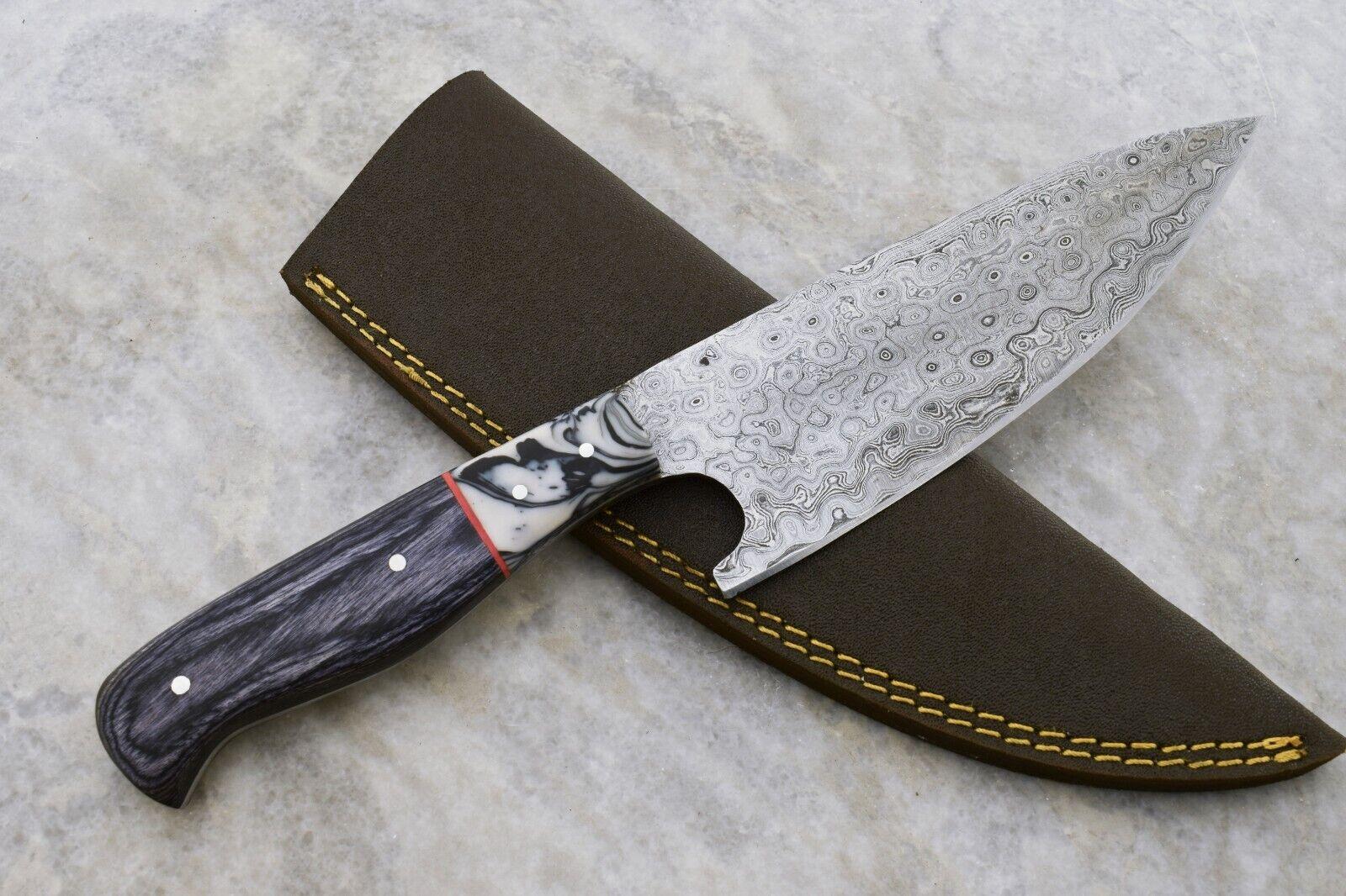 This handmade 10.5-inch Damascus steel chef and hunting knife is a masterfully crafted tool combining strength, precision, and aesthetic appeal. The knife features a 6-inch blade, a 4.5-inch hard wood handle, and comes with a premium leather sheath for safe storage and transport. The blade is forged from a high-quality mixture of 1095 and 15N20 steel, folded repeatedly to create intricate Damascus patterns with a minimum of 288 layers, then acid-burned to reveal multicolored layers. Sharpened at 20 degrees and oil-tempered to 58-60 HRC, this knife delivers exceptional edge retention and precise cutting for kitchen, hunting, or outdoor use.The full tang construction ensures strength, balance, and durability, while the leather sheath provides protection and portability. Each knife is 100% handmade, making it unique, collectible, and ideal for chefs, hunters, campers, or knife enthusiasts. This piece combines functionality, artistry, and reliability for long-lasting performance.
