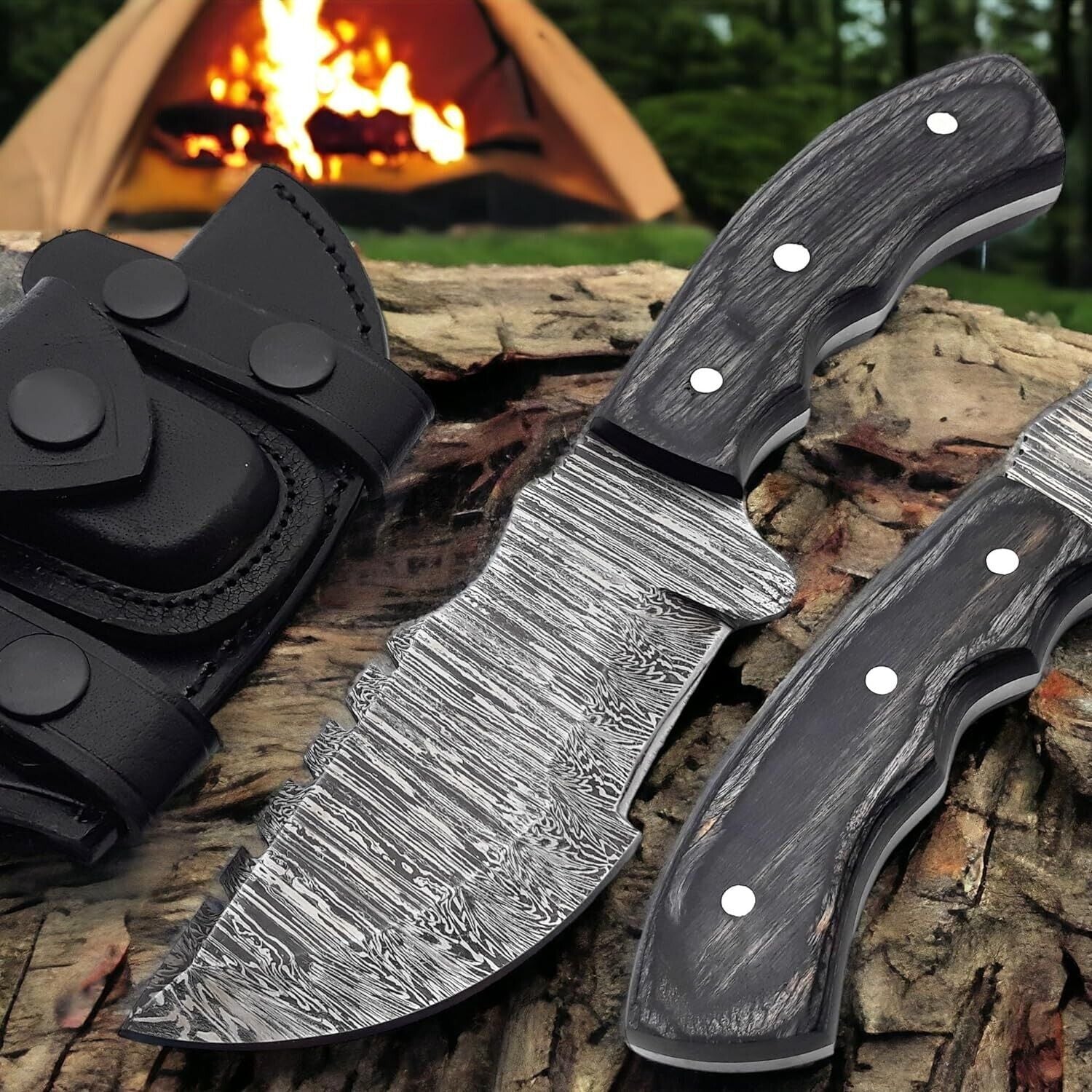 This handmade Damascus steel tracker knife is a versatile tool built for camping, hunting, survival, and everyday outdoor tasks. Measuring approximately 10 inches overall, it features a meticulously forged 5-inch Damascus steel blade with a straightback edge, offering exceptional sharpness, durability, and cutting power. The full tang design ensures strength and balance, while the 4.5-inch Paka wood handle provides a secure, comfortable grip with a natural aesthetic. Crafted to withstand demanding outdoor conditions, this knife is ideal for cutting, carving, food preparation, or survival use in the wilderness. Each piece is handmade in the United States and comes with a high-quality leather sheath for safe carry and storage. Combining functionality with craftsmanship, this tracker knife makes an excellent choice for hunters, campers, collectors, and outdoor enthusiasts.