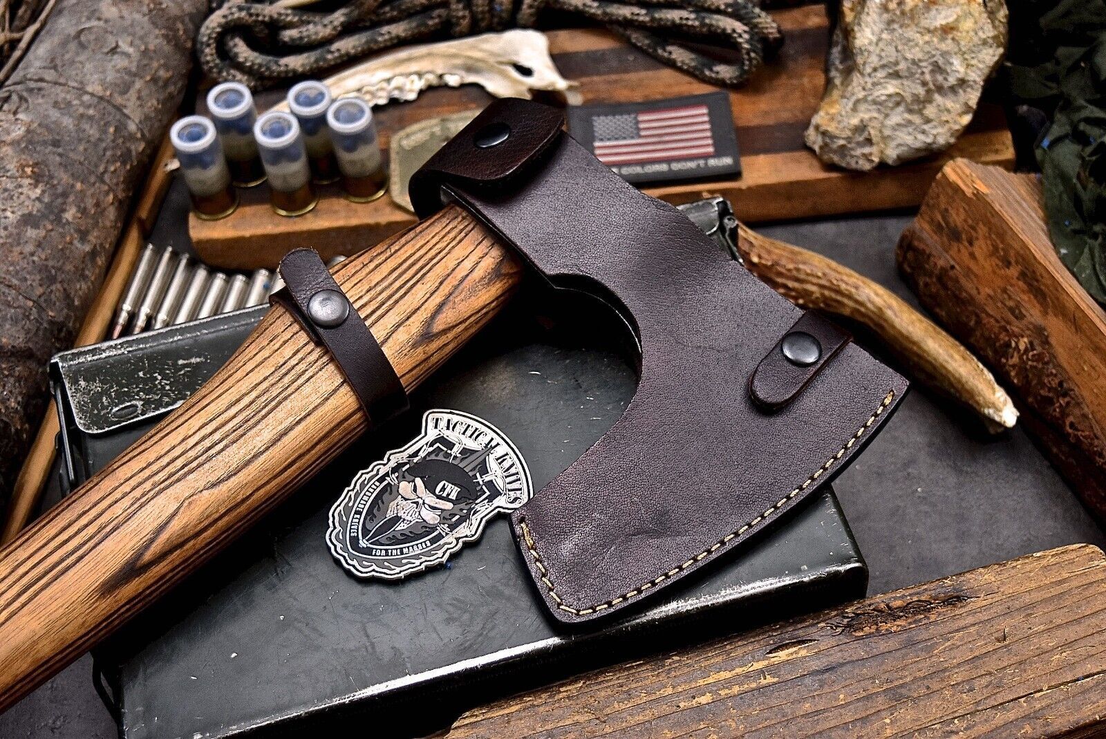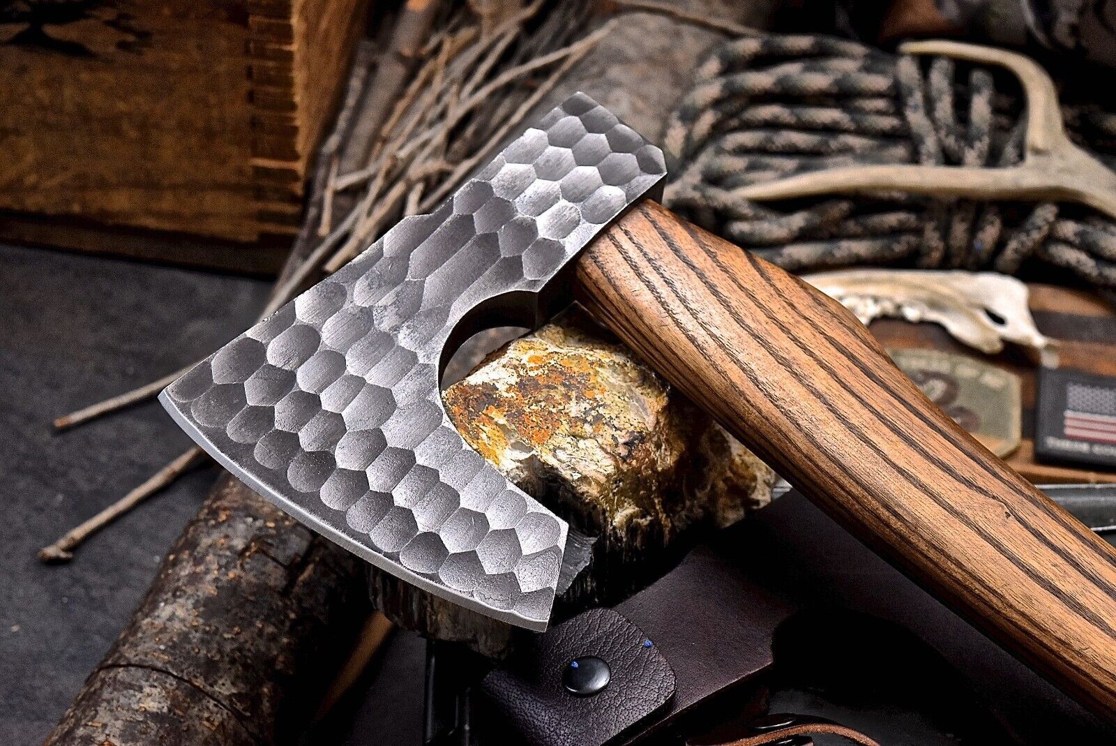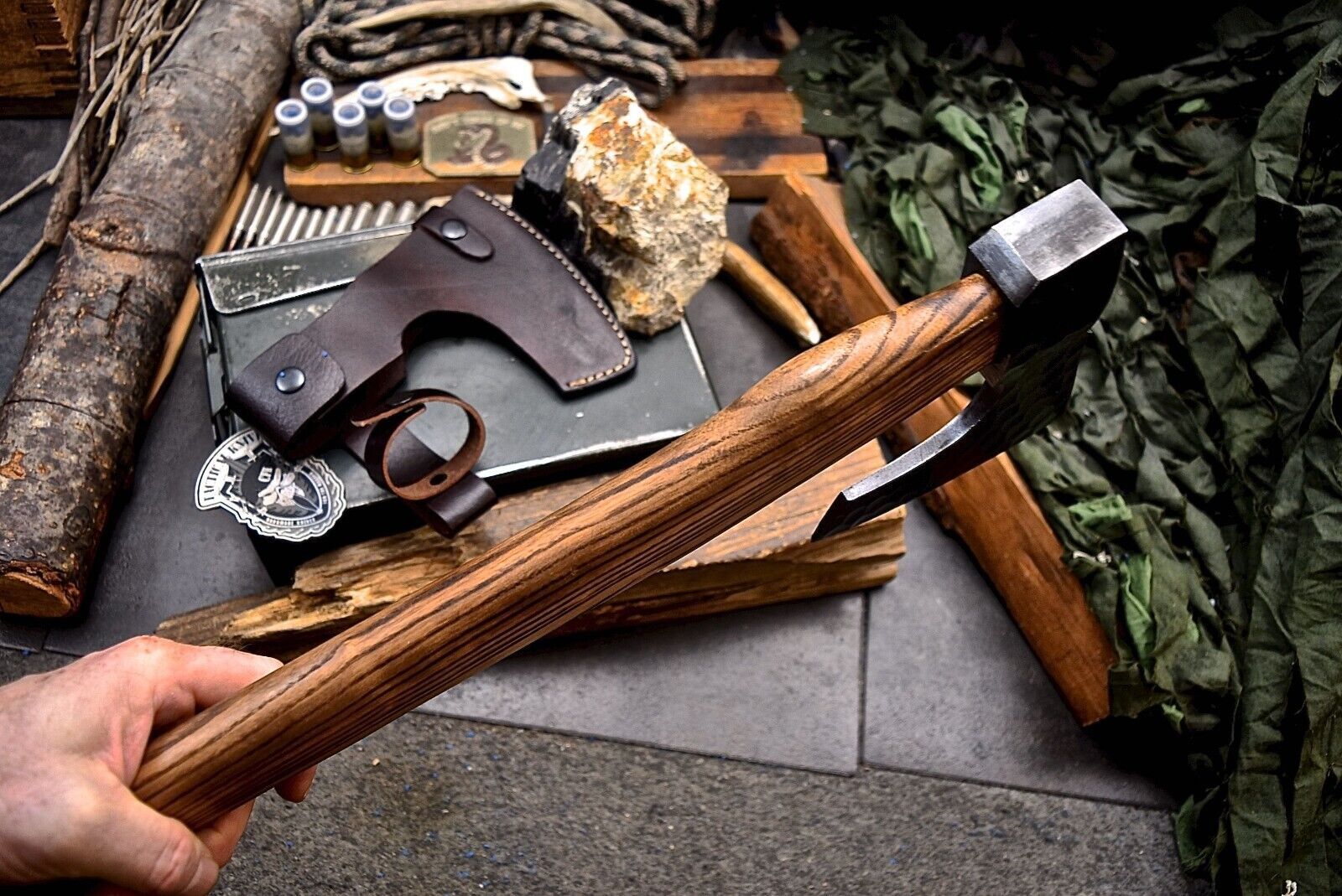 Experience the perfect combination of craftsmanship and functionality with this Handmade 1095 Forged Bearded Viking Axe. The axe features a stonewashed high-carbon 1095 steel blade, hardened to 56-58 HRC, offering exceptional cutting performance and durability. The forged blade measures 5.5 inches with a 7-inch head width, making it ideal for chopping, camping, and outdoor adventures. Its 18.25-inch jigged comfort-grip handle provides a secure and ergonomic hold, while the 7/8-inch thick spine ensures stability during heavy use. Each axe is handmade with no CNC machining or pre-cut blanks, making every piece unique with its own handcrafted characteristics. The axe comes with a high-quality cowhide leather sheath for safe storage and transport. Proper care is recommended: after use, wash the blade with soap and water, dry thoroughly, coat in olive oil, and store away from the sheath to prevent rusting. This bearded Viking axe is not only a functional tool for camping and outdoor enthusiasts but also a collector’s item for those who appreciate historical design and superior craftsmanship.
