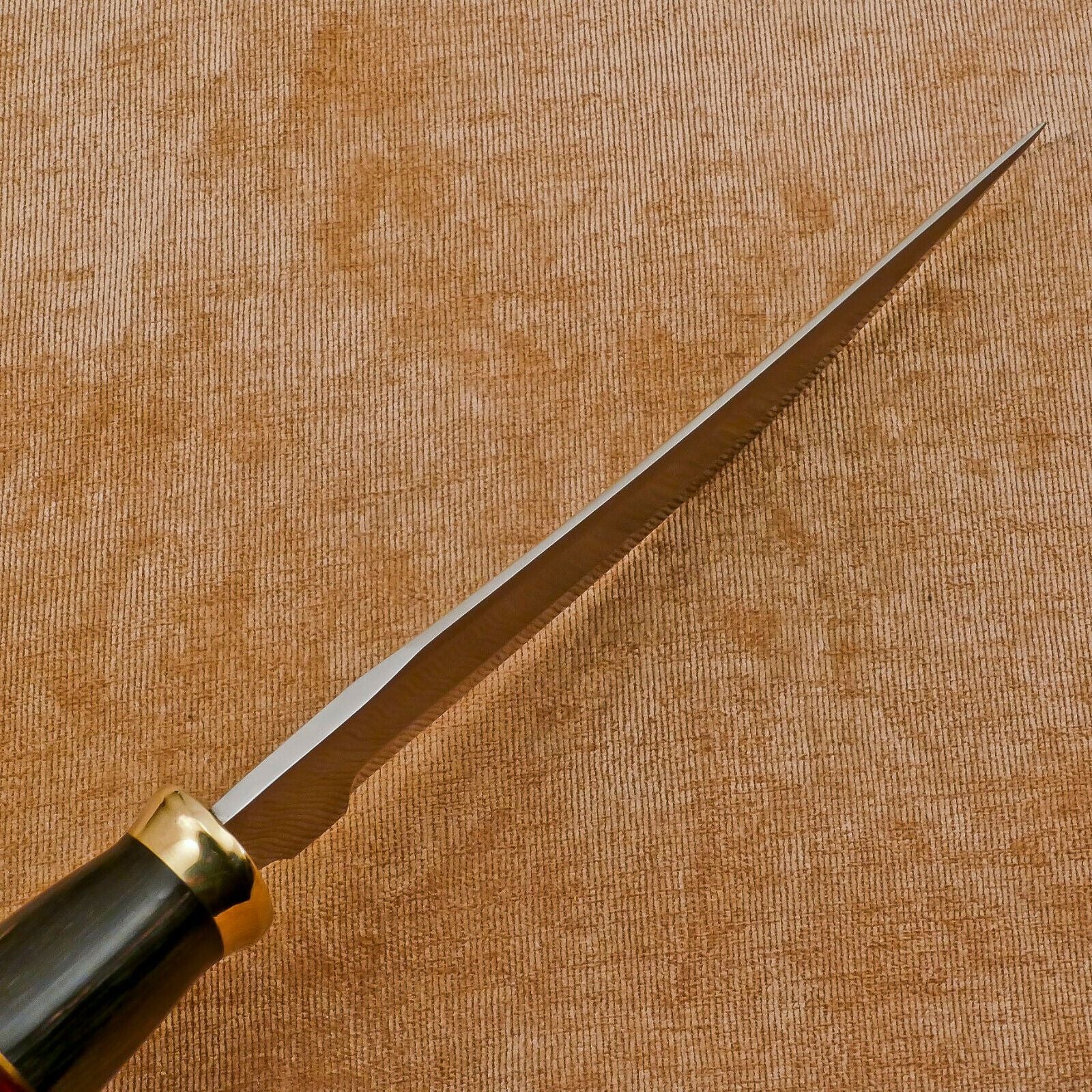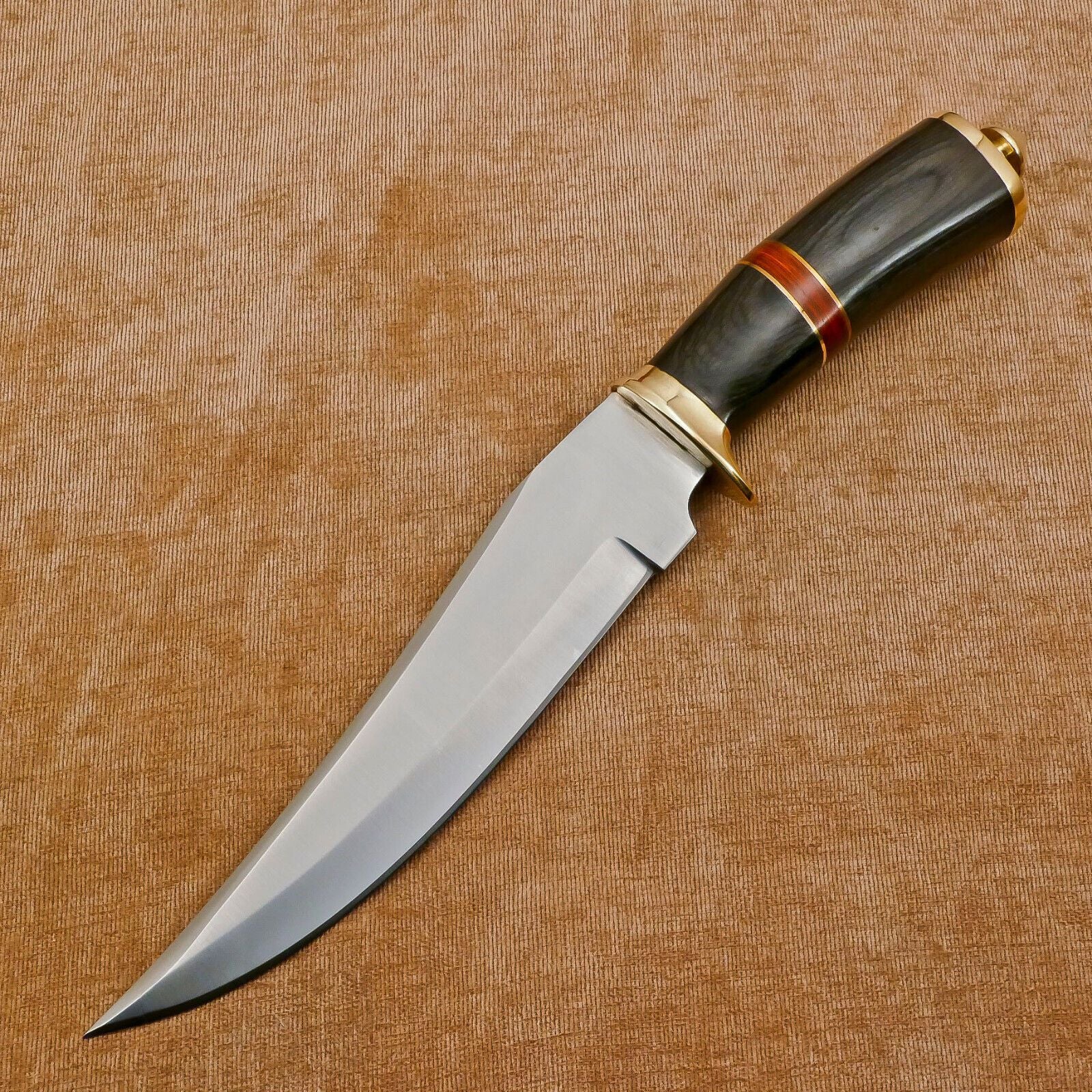 This handmade 12-inch D2 clip point fixed blade Bowie hunting knife is a premium tool crafted for hunters, outdoorsmen, and collectors who value strength, precision, and craftsmanship. Forged from high-quality D2 tool steel, the blade delivers razor-sharp cutting performance, excellent edge retention, and remarkable durability, making it suitable for skinning, chopping, slicing, and heavy outdoor use.The clip point blade design provides enhanced piercing capability and fine control, making it ideal for hunting and survival situations where precision is crucial. Built with a robust full tang construction, this Bowie knife ensures maximum strength and balance, reducing the risk of breakage during tough tasks. The ergonomically designed handle offers a secure and comfortable grip, allowing for prolonged use without hand fatigue.