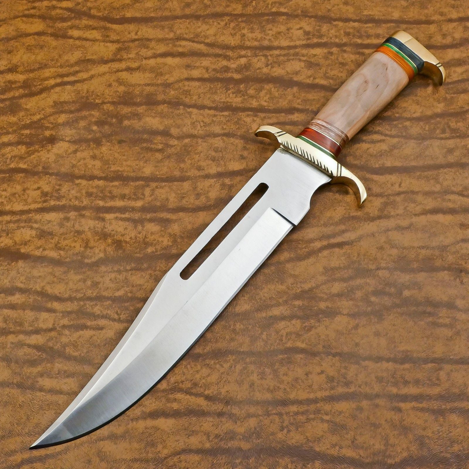 Elevate your outdoor adventures with this handmade D2 steel clip point Bowie hunting knife, crafted for precision, durability, and timeless style. Measuring 12 inches overall, this Bowie knife features a high-quality D2 tool steel blade, renowned for its sharpness, hardness, and long-lasting edge retention, making it ideal for hunting, camping, survival, and outdoor tasks.The olive wood handle provides a natural, elegant finish while delivering a secure, ergonomic grip for maximum control and comfort during extended use. Its full tang construction ensures strength and balance, making the knife capable of handling heavy-duty chopping, cutting, and skinning with confidence.Each knife is individually hand-forged by skilled artisans, combining functionality with the beauty of traditional craftsmanship. The package includes a handmade leather sheath for safe storage and convenient portability, making it ready for the field or a prized addition to a knife collection.