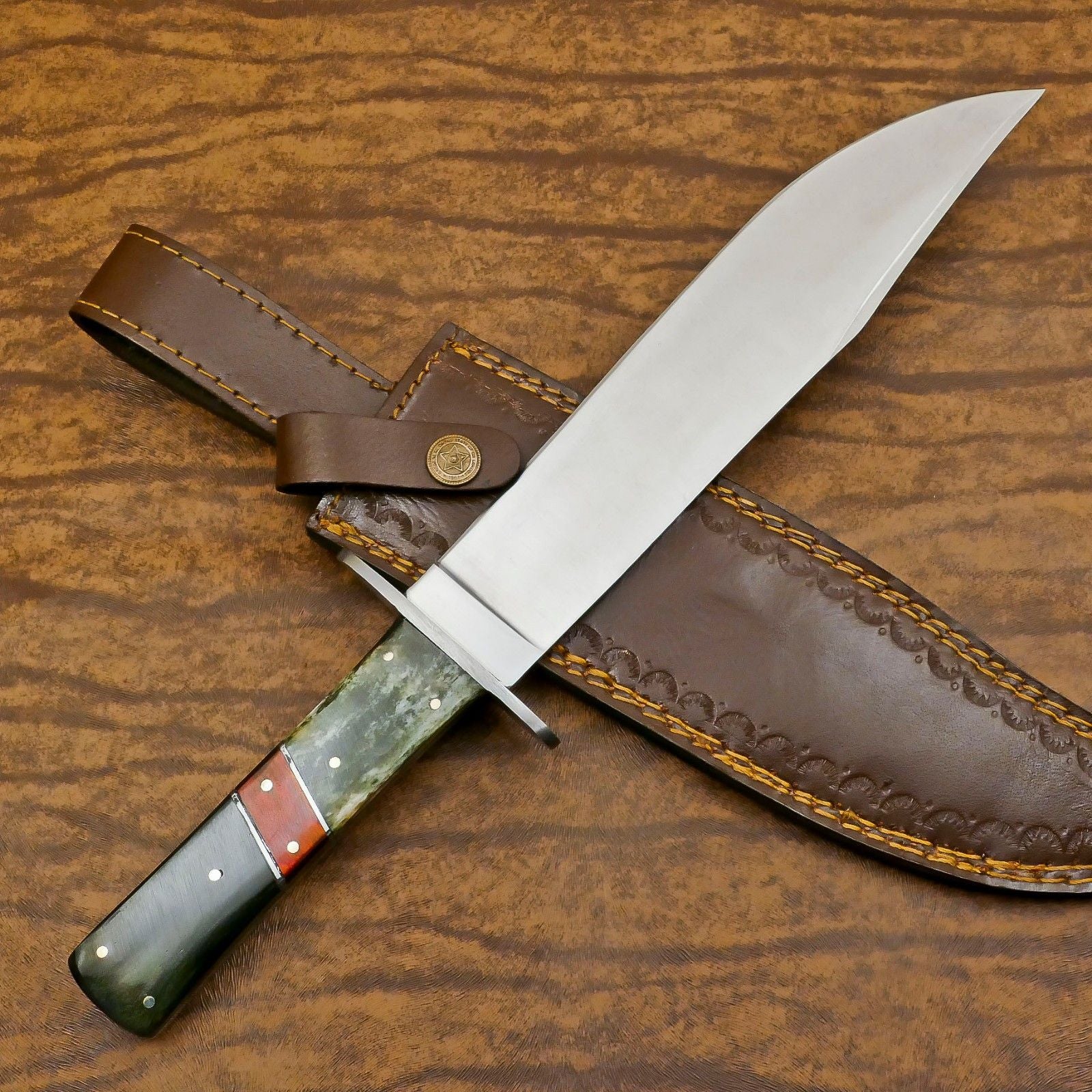 Take on every outdoor adventure with this handmade 12-inch D2 steel full tang Bowie hunting, sport, and camping knife. Designed for hunters, campers, survivalists, and collectors, this knife combines durability, precision, and craftsmanship in a single versatile tool. The premium D2 tool steel blade offers exceptional hardness, excellent edge retention, and outstanding wear resistance, making it ideal for chopping, slicing, piercing, and skinning during hunting trips, camping excursions, or survival activities. Its classic Bowie-style design provides reliable performance for all outdoor tasks, while its size and strength make it perfect for sport and survival applications.The full tang construction ensures maximum strength, balance, and resilience, allowing the knife to handle heavy-duty tasks with ease. The ergonomically designed handle offers a secure and comfortable grip, reducing hand fatigue during extended use while providing precise control. Each knife is meticulously handcrafted by skilled artisans, giving it unique character and artisanal quality that sets it apart from mass-produced alternatives. A custom leather sheath is included for safe storage and convenient portability, making this Bowie knife ready for immediate outdoor action. Rugged, reliable, and beautifully crafted, this 12-inch D2 steel full tang Bowie hunting, sport, and camping knife is an essential tool for serious outdoor enthusiasts and collectors alike.