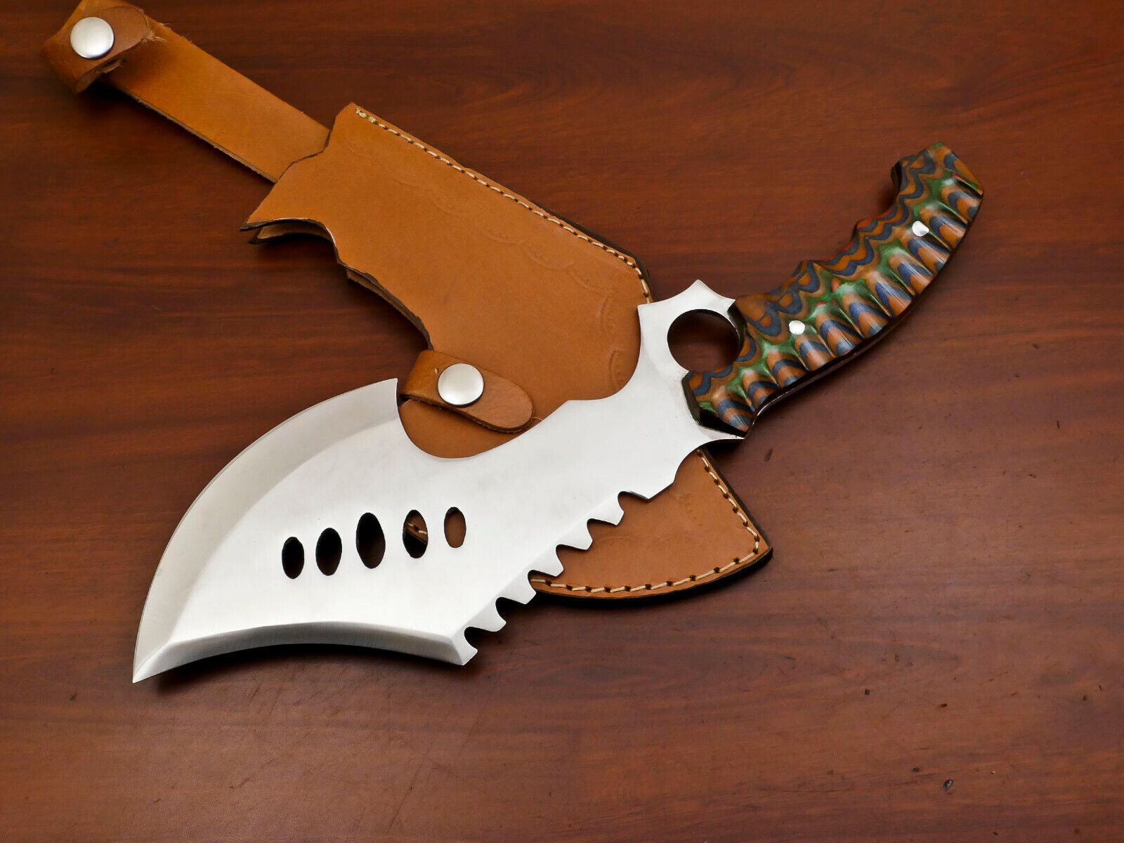 This handmade 12-inch full tang chopper Bowie knife is expertly crafted from premium D2 steel and features a custom Pakka wood handle, combining durability, precision, and aesthetic appeal. Designed for hunters, campers, survivalists, and knife collectors, this versatile Bowie knife excels in chopping, slicing, piercing, and skinning tasks, making it an essential tool for outdoor adventures. The D2 steel blade offers exceptional hardness, wear resistance, and edge retention, ensuring reliable performance in rugged conditions.Full tang construction provides superior strength, balance, and durability, allowing this knife to withstand demanding outdoor use. The ergonomically shaped Pakka wood handle ensures a secure and comfortable grip for extended periods, minimizing hand fatigue while providing excellent control. Each knife is individually handmade by skilled artisans, offering unique character and craftsmanship that sets it apart from mass-produced alternatives. A custom leather sheath is included for safe storage and convenient carry, making this Bowie knife ready for hunting trips, camping excursions, or survival situations. Rugged, reliable, and beautifully crafted, this 12-inch full tang chopper Bowie knife with D2 steel blade and Pakka wood handle is perfect for outdoor enthusiasts and collectors alike.