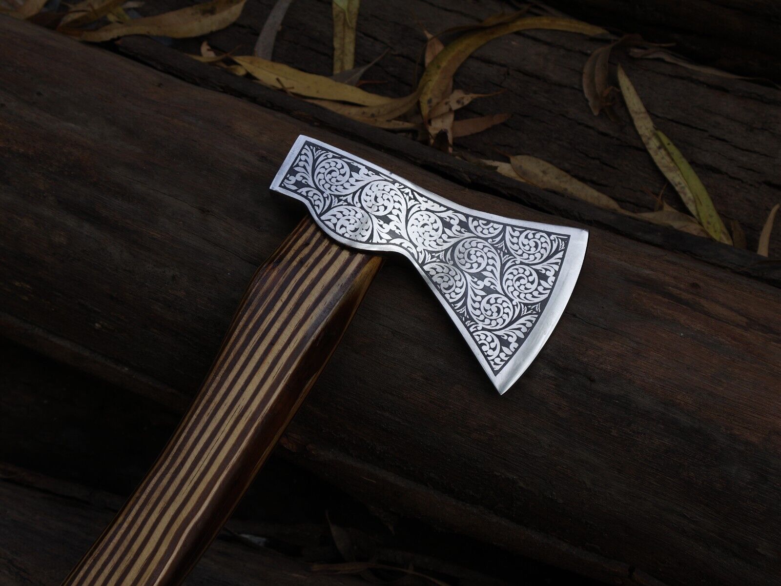 The hand engraved ash wood handle provides a comfortable, secure grip and adds a touch of traditional Nordic artistry. Each axe is 100% handmade, ensuring that no two pieces are exactly alike, with natural variations in wood grain adding to its uniqueness. Included is a high-quality leather sheath for safe storage and easy transport. Perfect as a gift for outdoor enthusiasts, collectors, or history enthusiasts, this tomahawk combines historical design with modern utility, making it a versatile tool and display piece. Its durable construction and exquisite detailing make it a standout addition to any collection.