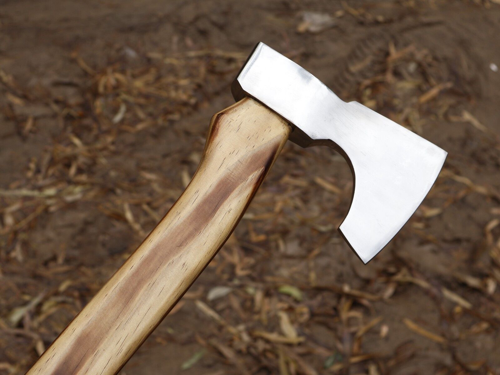 This handmade Viking tomahawk axe is a perfect combination of authentic craftsmanship and rugged durability. Measuring 18 inches in total length, it features a dull polish carbon steel blade with a 4.5-inch cutting edge and 6.5-inch blade width, hardened to 58–60 HRC for reliable performance. Each axe is fully functional, ideal for camping, chopping, throwing, or as a striking Viking-inspired collectible.