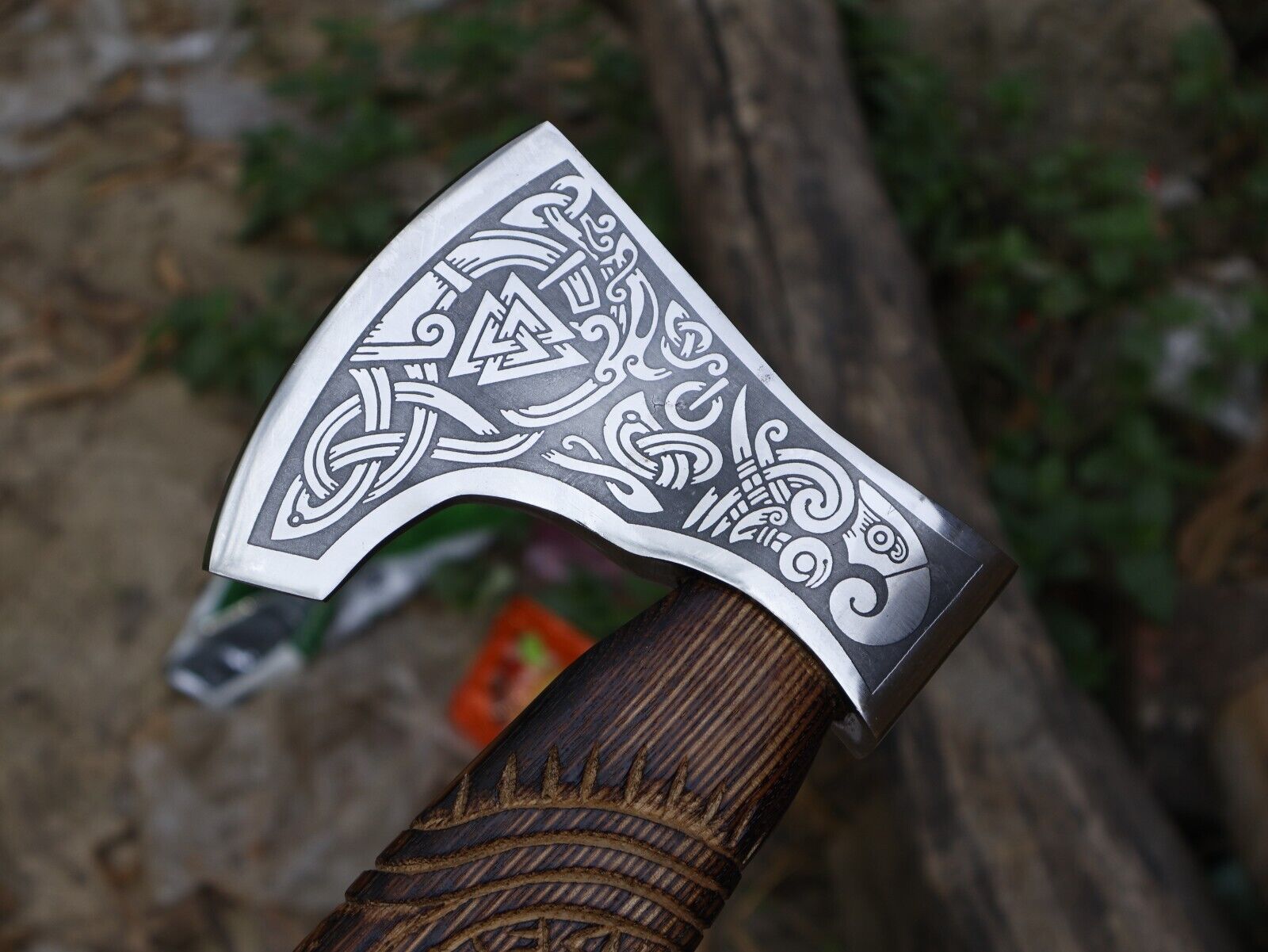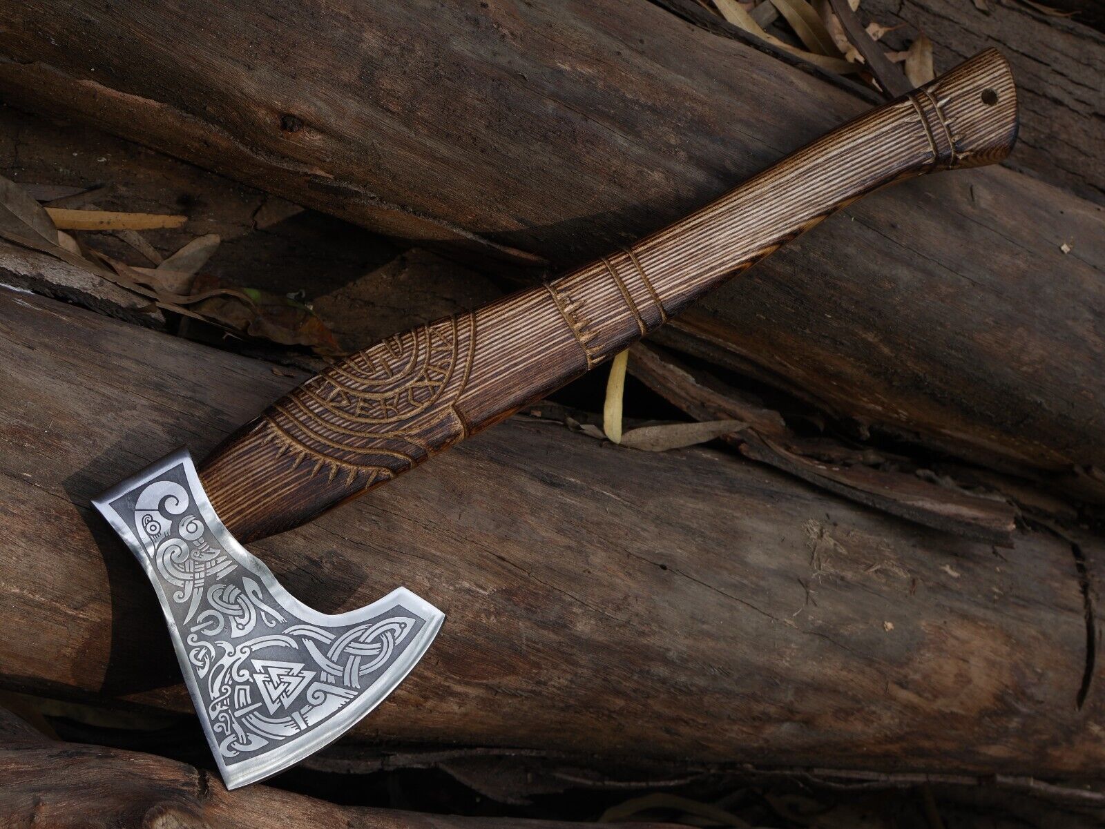 The hand-engraved Ash wood handle provides a secure and comfortable grip while reflecting exquisite Norse artistry. Accompanied by a thick, high-quality leather sheath, this axe is safe for storage and easy to carry. Fully handmade, each axe is unique, with individual characteristics that highlight its craftsmanship. Ideal for camping, hunting, outdoor use, or as a collectible gift, this Viking axe is not only a functional tool but also a beautiful piece of artistry that brings the spirit of ancient Nordic warriors to life.