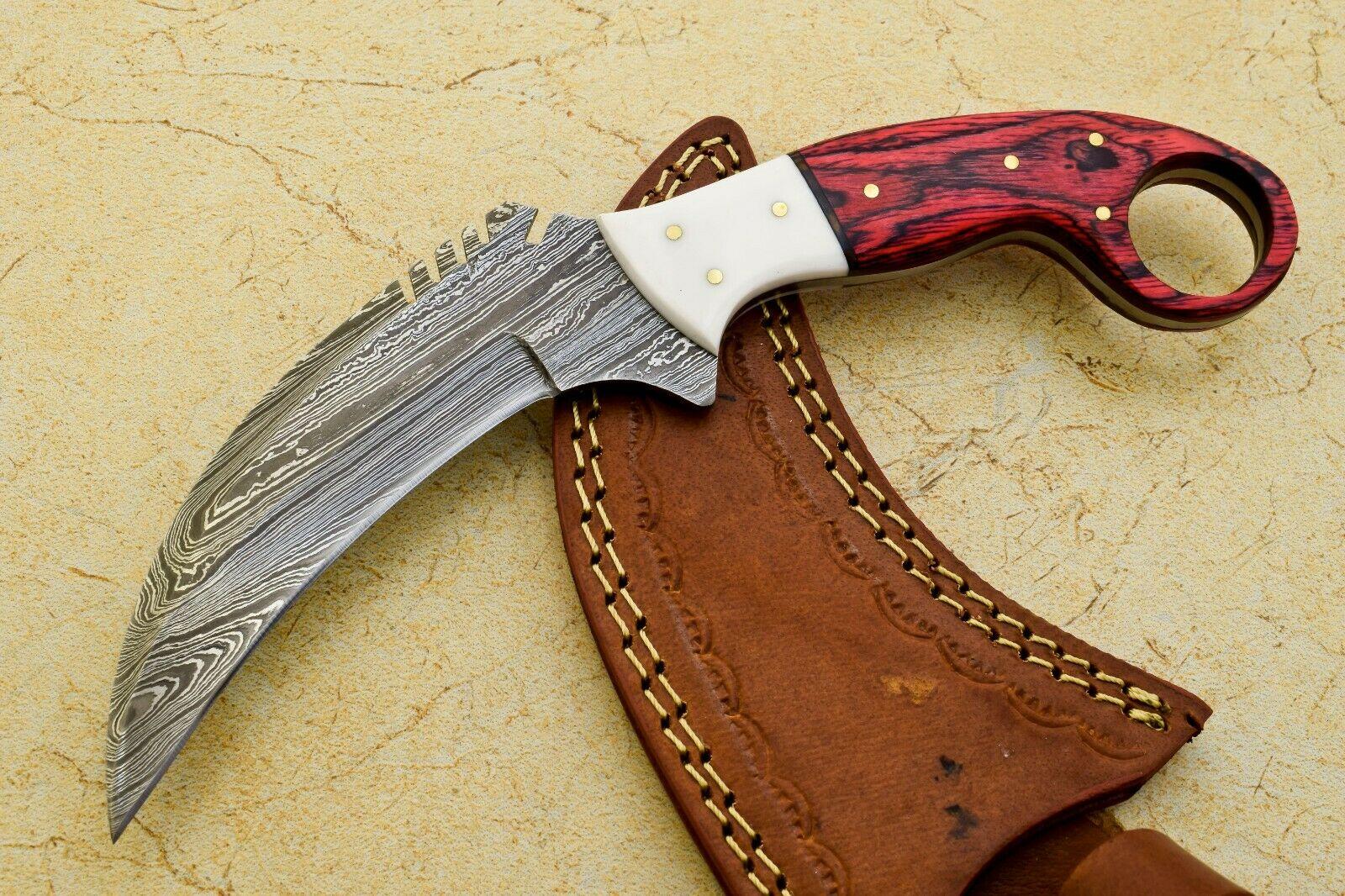 This full tang damascus karambit features a durable handle crafted from wood and resin materials.Its solid construction improves balance and handling during outdoor activities. Paired with a leather karambit with sheath, it allows safe storage and convenient carry.