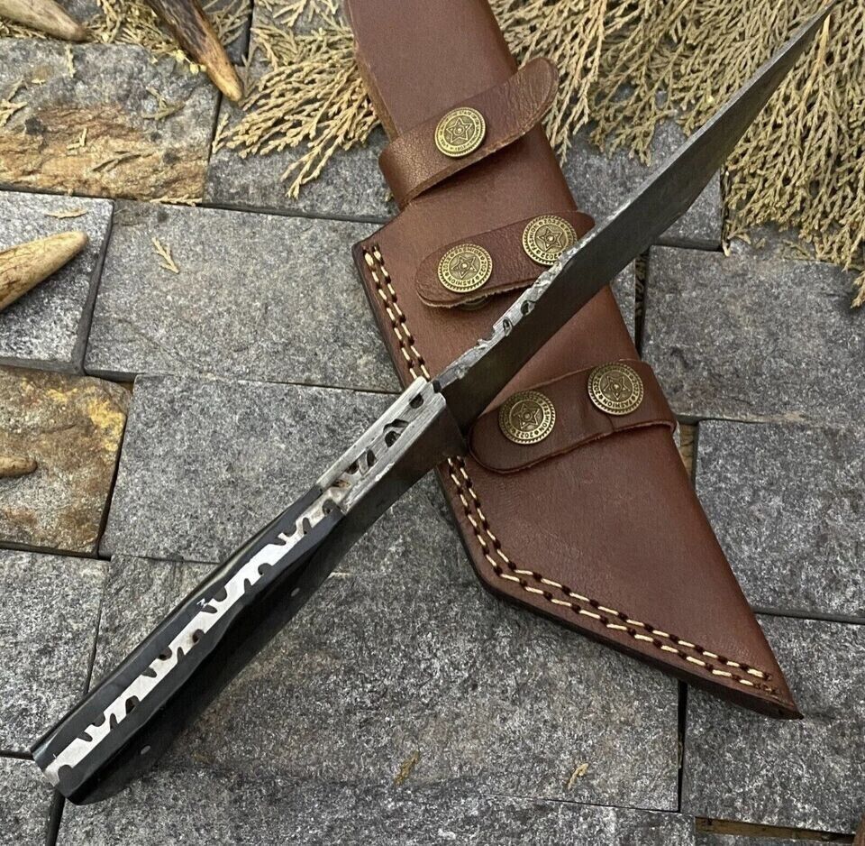 This Handmade Bushcraft Tracker Hunting Knife is a custom-forged Damascus steel masterpiece, designed for hunters, campers, and outdoor survival enthusiasts. Built with precision and craftsmanship, the knife features a 5.5-inch blade hand-forged from 512 layers of 4340 stainless steel and 1075 high carbon steel, producing a striking raindrop Damascus pattern. With a Rockwell hardness rating of 55–58 HRC, the blade is exceptionally sharp, strong, and reliable, capable of withstanding demanding outdoor tasks.The overall length of this knife is 10.5 inches, perfectly balanced with a 5-inch bull horn handle that provides a firm, comfortable, and non-slip grip. The full tang construction ensures maximum durability and stability, making it an excellent tool for chopping, carving, skinning, and general bushcraft or hunting tasks. Each blade also showcases hand-filed work, highlighting its authenticity and the skill of traditional knife-making techniques.This tracker knife comes with a premium leather sheath, offering safe storage and convenient carrying during your outdoor adventures. Perfect for hunters, campers, survivalists, and collectors, this handmade Damascus steel knife is a true combination of strength, function, and elegance, built to serve as both a practical tool and a collectible piece.