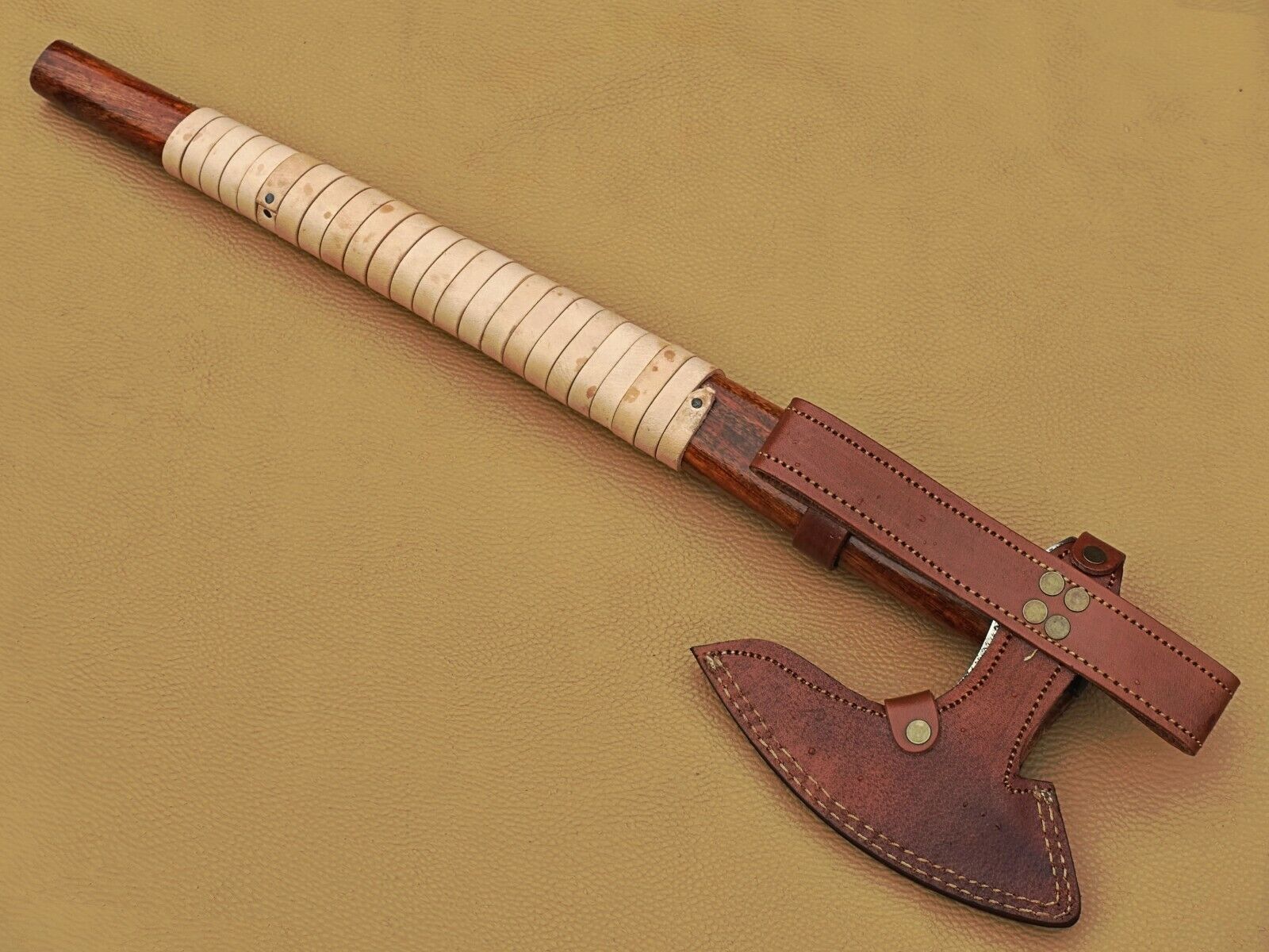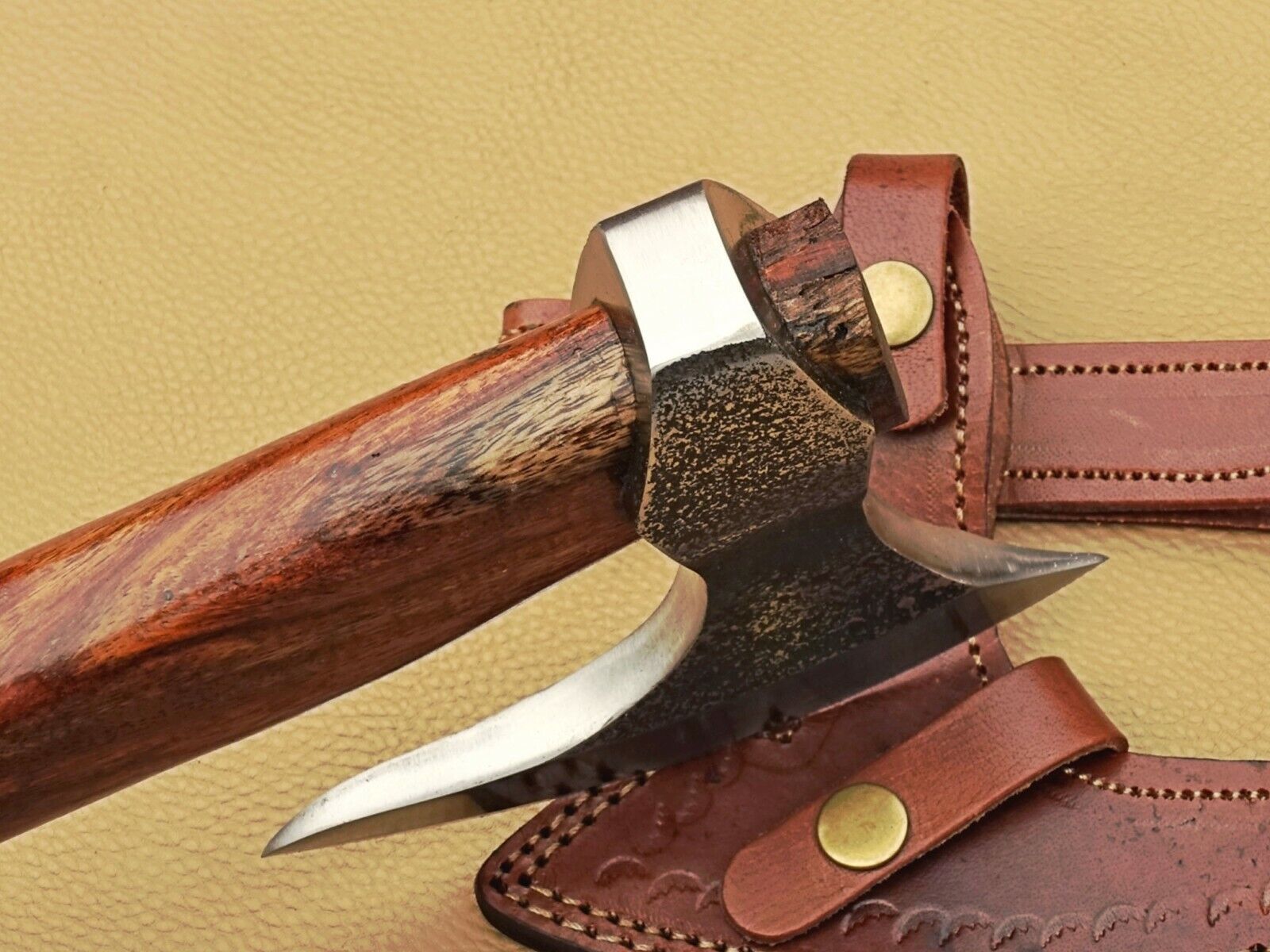 This custom handmade Viking axe is a functional and beautifully crafted tool, perfect for camping, bushcraft, or display. The axe features a Godzilla-style bearded blade forged from high-quality carbon steel, razor-sharpened for exceptional cutting performance. The total length of the axe is 21 inches (530 mm), with a blade length of 7 inches (180 mm), providing an ideal balance of control and power. The handle is made from high-polished walnut wood, featuring a brass lanyard hole for convenience and added style. Each axe comes with a genuine bull’s leather sheath to protect the blade and ensure safe storage or transport. Designed for both utility and aesthetic appeal, this Viking axe combines traditional craftsmanship with modern functionality, making it a must-have for collectors, outdoor enthusiasts, and Norse history admirers.
