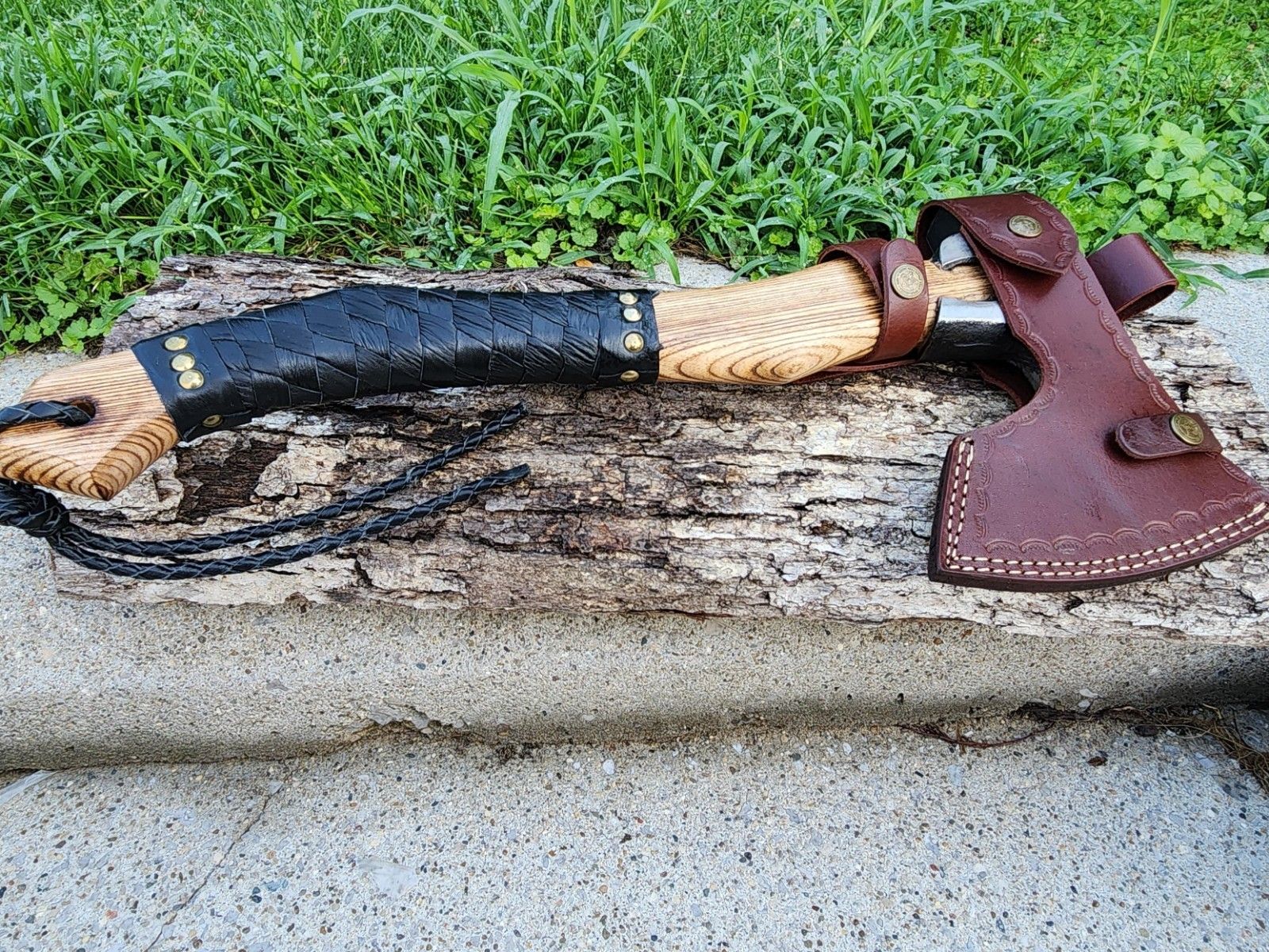 Handmade Carbon Steel Viking Axe with Wooden Handle and Leather Sheath
