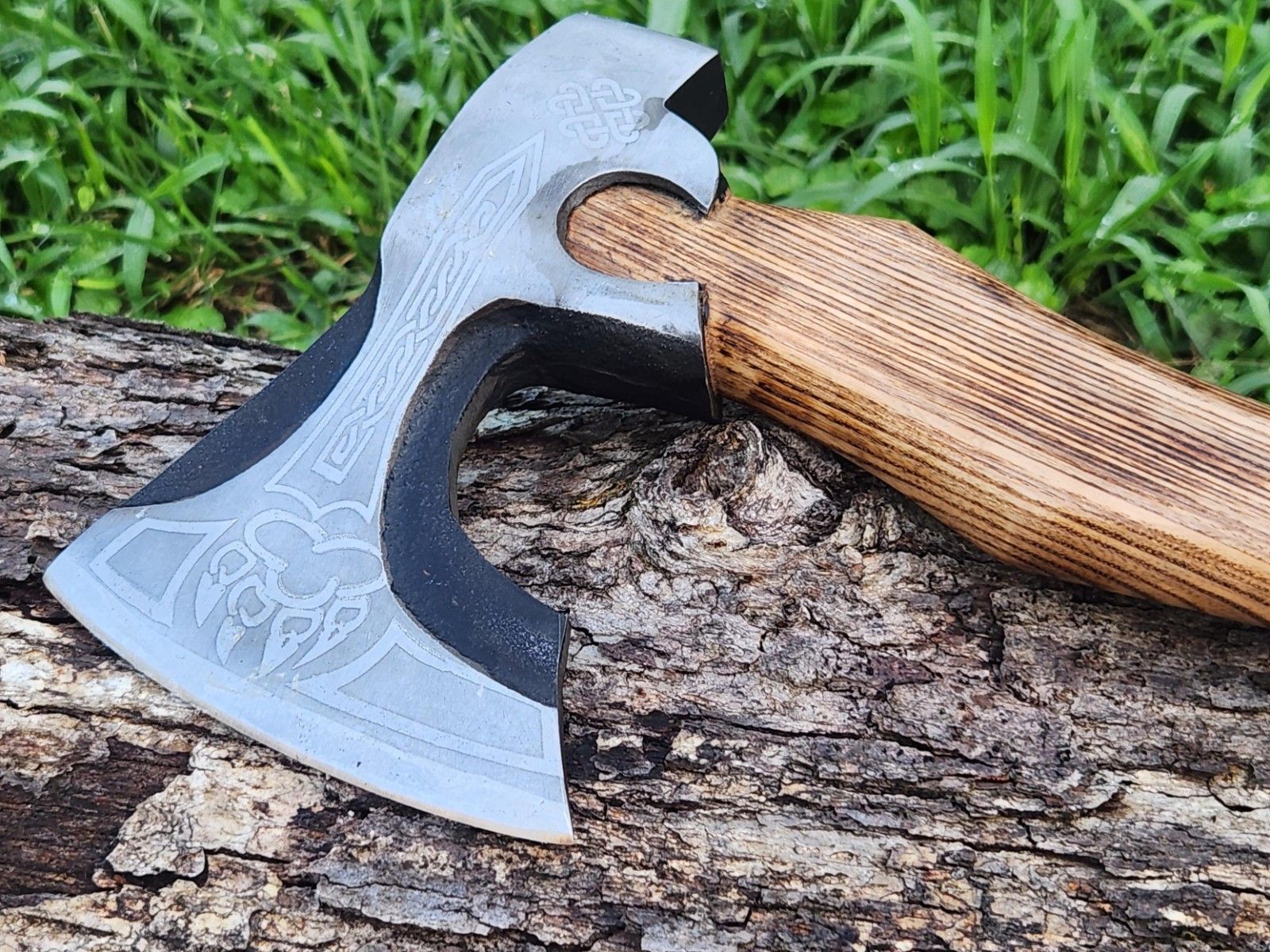 Each piece comes with a custom leather sheath, designed for safe storage and convenient portability. Whether you are an outdoor adventurer, a history enthusiast, or looking for a unique gift, this Viking axe serves as a versatile and authentic addition to your collection.