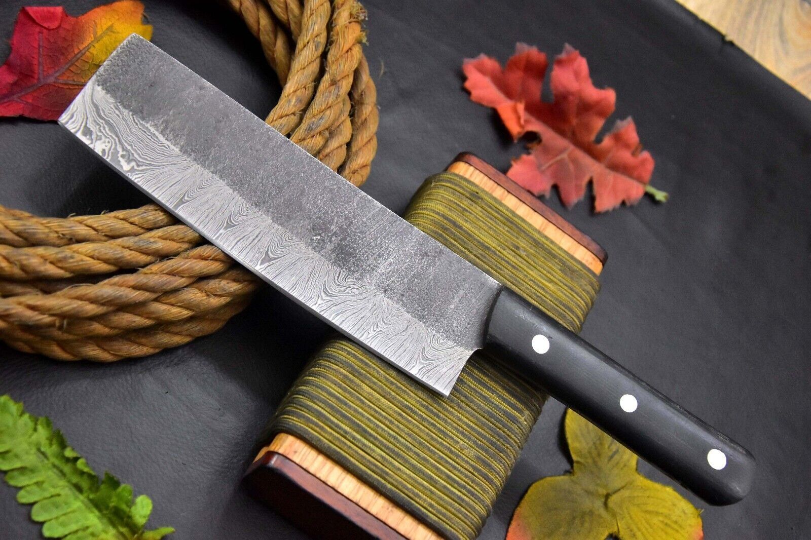 This Handmade Custom Hammered Damascus Steel Fixed Blade Chef Nakri Knife combines exceptional craftsmanship with premium performance, making it an ideal choice for professional chefs and cooking enthusiasts. Forged from high-quality Damascus steel with a striking hammered finish, this knife offers durability, precision, and elegance in every cut. The ergonomic G‑10 Micarta handle ensures a firm grip and comfortable handling, even during extended use.