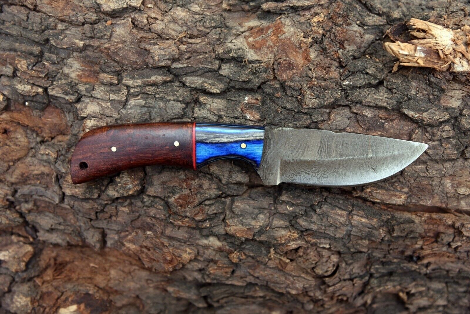 This handmade custom skinner knife is a fine example of craftsmanship and functionality, designed for hunting, camping, and field use. Featuring a full tang construction and a 3.5 to 4-inch Damascus steel blade, this knife delivers exceptional edge retention, sharpness, and strength. The blade showcases a striking multi-color Damascus twist pattern, adding a unique visual appeal to its rugged functionality.