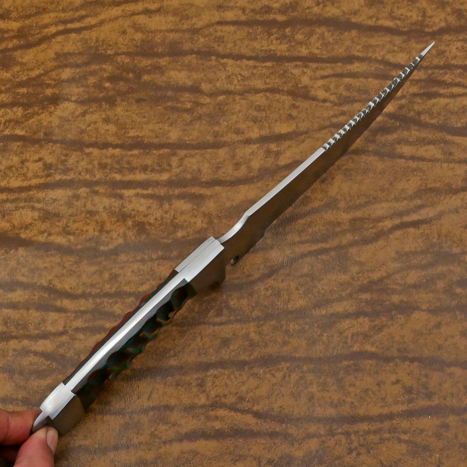 Step up your outdoor adventures with this Handmade D2 Bowie Hunting Knife, featuring a 12-inch full tang blade forged from high-quality D2 tool steel. Known for its remarkable hardness, edge retention, and durability, this knife is perfect for hunting, camping, survival, and tactical use. The full tang construction ensures balance, strength, and control, making it ideal for chopping, cutting, and field dressing tasks with precision and confidence.The ergonomic Pakka wood handle provides a comfortable and secure grip while showcasing natural wood grain patterns, giving each knife a unique appearance. Its polished finish is resistant to moisture and wear, ensuring long-lasting reliability even in rugged outdoor conditions.