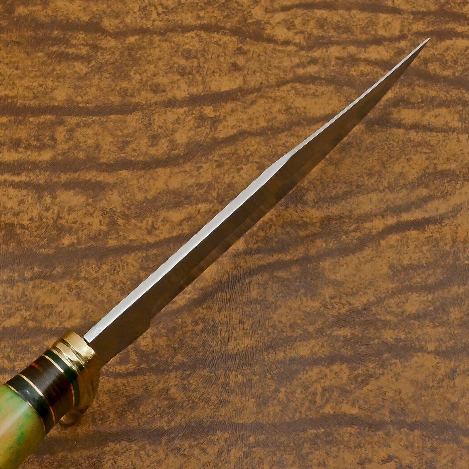 This handmade D2 steel Bowie EDC hunting knife is crafted to deliver strength, durability, and timeless style. Measuring 12 inches in overall length, the knife features a razor-sharp D2 steel blade, known for its high hardness and excellent edge retention, making it perfect for heavy-duty outdoor use. Whether you’re on a hunting trip, camping in the wild, or preparing for survival situations, this full tang Bowie knife provides the performance you can count on.The handle is made from a stunning combination of natural bone and polished wood, giving it both elegance and functionality. This blend not only enhances the knife’s beauty but also ensures a comfortable and firm grip, even during extended use. The sturdy handguard provides added safety, while the balance of the knife allows for smooth handling in various tasks such as skinning, chopping, and general outdoor work.