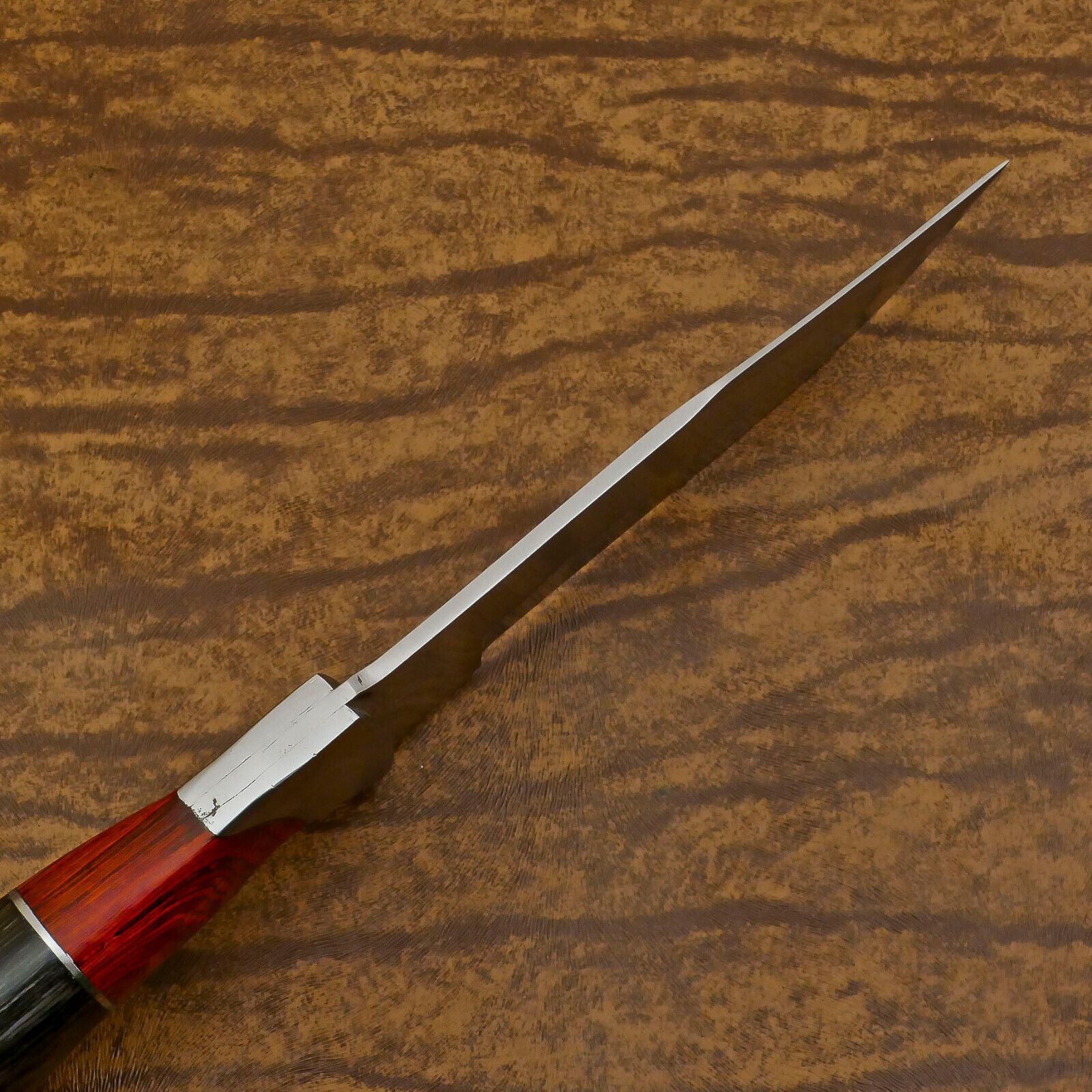 Experience the perfect balance of durability, craftsmanship, and style with this handmade D2 steel Bowie EDC hunting knife. Measuring 12 inches overall, this full tang knife is built to handle outdoor adventures, hunting trips, and everyday carry with ease. The razor-sharp D2 steel blade is known for its incredible hardness, toughness, and superior edge retention, ensuring that it stays sharp even after heavy use.The knife features a Pakka wood handle, polished to perfection for both beauty and functionality. Its ergonomic design provides a comfortable and secure grip, reducing fatigue during extended use. The full tang construction adds extra strength and balance, making it a reliable choice for survival tasks, skinning, camping, and general outdoor activities.